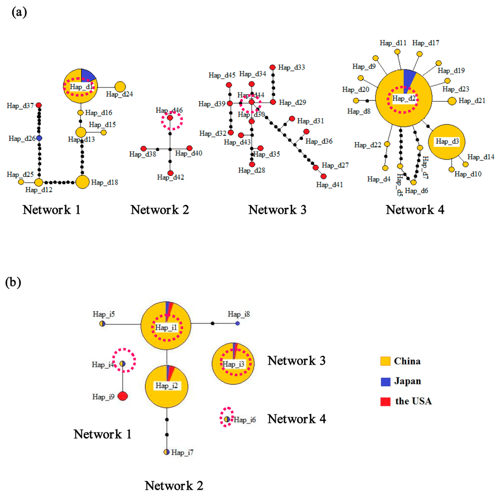 As regards the mitochondrial control region, the 291 individual samples comprised 46 unique haplotypes, and the statistical parsimony analysis in TCS (which is a software to estimate phylogenetic network using statistical parsimony) revealed four distinct networks (Figure 2a). Four haplotypes (Hap_d1, Hap_d2, Hap_d44, and Hap_d46) were inferred to be ancestral because they yielded the highest outgroup weights in each of the networks (0.24, 0.40, 0.20 and 0.25, respectively) [25]. Network 1 contained 10 haplotypes found in the samples collected from the USA, Japan and China. Network 2 included four haplotypes and Network 3 included 15 haplotypes, all of which only occurred in the samples collected in the USA. Network 4 contained 17 haplotypes found in the individuals from Japan and China (Figure 2a and Figure S1). In addition, Network 4 was characterized by a closed loop instead of a linear relationship connecting haplotypes, suggesting the presence of homoplasy [26]. The 196 specimens examined using the proPOx intron sequences comprised nine unique haplotypes, and the statistical parsimony analysis revealed four distinct networks and two haplotypes (Networks 3 and 4) that could not be connected with a confidence limit of 95% [26] (Figure 2b). Four haplotypes (Hap_i1, Hap_i3, Hap_i4, and Hap_i6) were inferred to be ancestral because they yielded the highest outgroup weights in each of the networks (0.46, 1.00, 0.50 and 1.00, respectively) [25]. Network 1 included two haplotypes that were found in samples from the USA, Japan and China (Figure 2b and Figure S1). Network 2 contained five haplotypes that were found in the populations collected from the USA, Japan and China. Network 3 also contained only haplotype Hap_i3, found in the American, Japanese and Chinese populations. Network 4 only contained the haplotype Hap_i6, found in one Chinese population (population QJ) and the Japanese population.