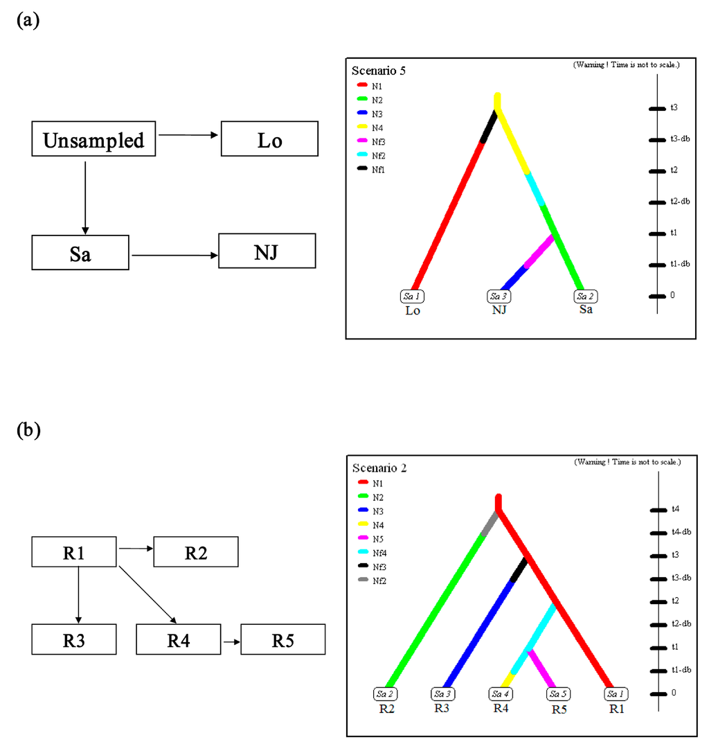 Historical scenarios supported by highest posterior probabilities in analyses using Approximate Bayesian Computation and schematic representation of the competing scenarios considered for the inference of the invasion routes. (a) Historical scenario supported by highest posterior probabilities and its schematic representation for cluster 1; (b) Historical scenario supported by highest posterior probabilities and its schematic representation for cluster 2. The values of the sample sizes that were measured in number of individuals were N and Nf. The values of times that were measured in number of generations were db and t. The populations (Lo, Sa and NJ) with effective populations sizes N1, N2 and N3, at time/generations t3-db, t2-db and t1-db, diverged from ancestral populations with effective populations sizes Nf1, Nf2 and Nf3, which were from an population with effective population size of N4 at time/generations t3, t2 and t1 respectively. R1 contained the sampling populations XYw, XYc, XG, BGt, XBv, DY, MAS, HF and CH; R2 included JX, ZX and CQ; R3 included YNL, CHL, QJ, NHL, LZL, XT, HHL, DTLs, DTL, YJ and NX; R4 contained WJ, CJr, SLt, NBp, PYL and NCyL; R5 included WX, WXb, NT, JX, SH and NB. The populations (R2, R3, R4 and R5) with effective populations sizes N2, N3, N4, and N5, at time/generations t4-db, t3-db, t1 and t1-db, diverged from ancestral populations with effective populations sizes Nf2, Nf3 and Nf4 which were from an population with effective population size of N1 at time/generations t4, t3 and t2 respectively.