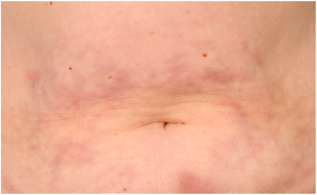 The most common cutaneous adverse events in MS patients using interferons are local injection site reactions. These include redness/erythema of the skin, bruises, eczema-like reactions, pain, pruritus, swelling and induration of the skin around injection sites (Figure 1). These symptoms usually appear shortly after starting interferon therapy, but may also appear several years after implementation of interferons []. Mild skin reactions occur in up to 90% of the patients using the s.c. application route. In comparison, only 33% of patients using i.m.-injected interferon complain of cutaneous adverse events []. Local injection site reactions are seen more frequently in areas with reduced subcutaneous fat tissue []. A wrong injection technique with injections being applied too superficially into the tissue (intradermal vs. subcutaneous injection) may also contribute to the occurrence of local site reactions.