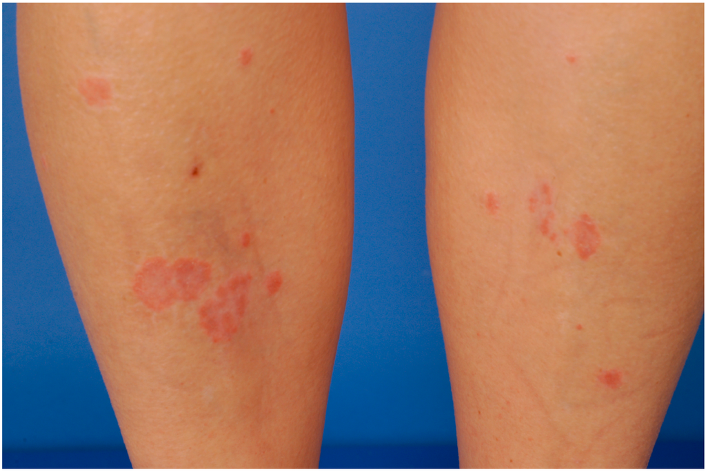 Scaly erythematous plaques occurring on the lower extremity 6 months after initiation of interferon-β (IFN-β).