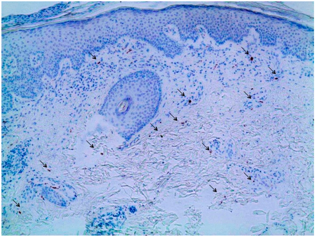 Immunohistochemistry of a skin biopsy obtained from the right thigh showing a mixed inflammatory infiltrate in the dermis with intermingled Interleukin 17 (IL17)-expressing cells (arrows). Furthermore, psoriasiform epidermal hyperplasia with hyperkeratosis and parakeratosis can be observed. Magnification 100-fold.