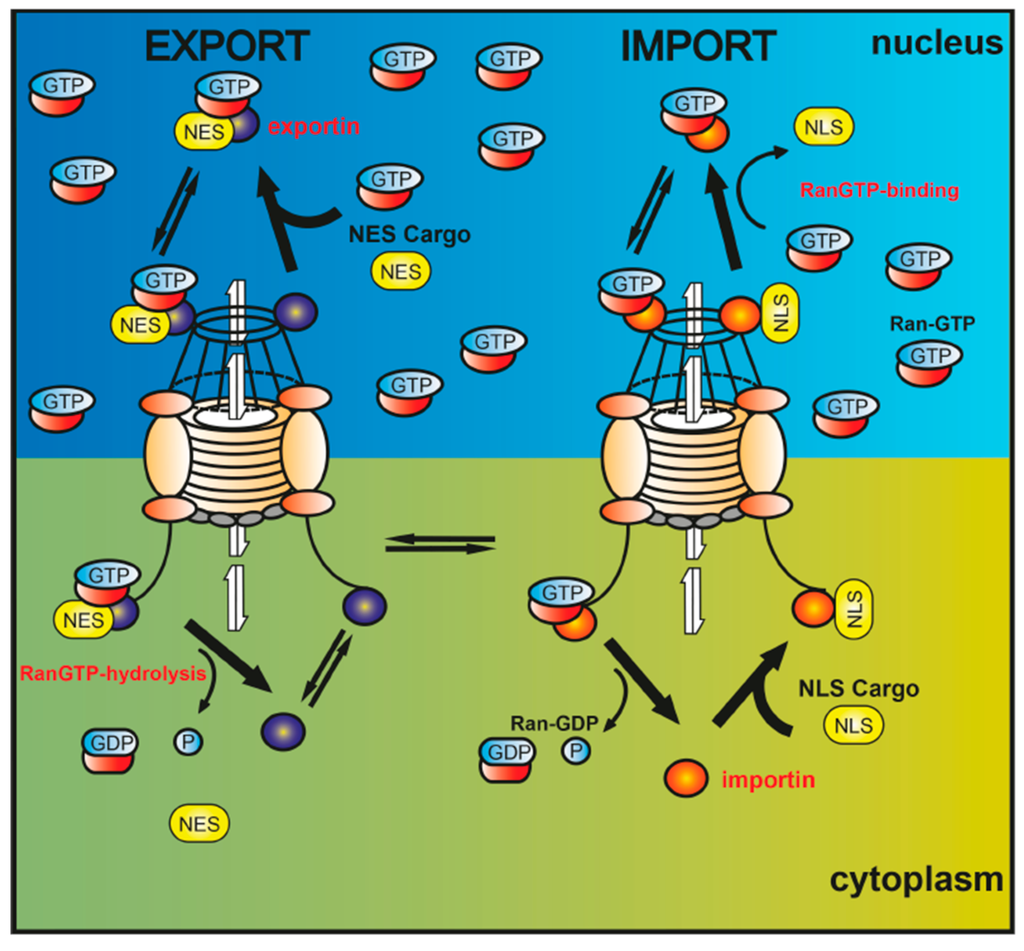 Nuclear import of cargo proteins implicates the recognition of a nuclear localization sequence (NLS) by importin receptors. In the nucleus, importins are dissociated from the cargo through the binding of Ran-GTP. Nuclear guanine-nucleotide exchange factors (GEFs) maintain elevated nuclear Ran-GTP concentration levels. On the other hand, translocation to the cytoplasm is facilitated by a nuclear export sequence (NES), recognized by exportin receptors such as CRM1 and further interacting with Ran-GTP. Upon translocation of the export complex to the cytoplasm, the cargo dissociates from the complex by means of GTPase-activating proteins (GAP)-mediated hydrolyzation of Ran-GTP to Ran-GDP.