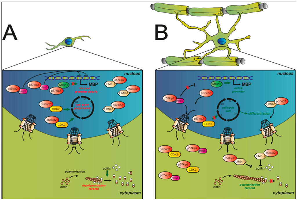 (A) In early stages of oligodendroglial precursor cell (OPC) differentiation p57kip2 is predominantly located in nuclei. Kinase binding partners such as LIM Domain Kinase 1 (LIMK-1) and CDK2 appear to colocalize with p57kip2. Nuclear presence of CDK2 results in maintenance of cell cycle progression, while nuclear LIMK-1 is unable to inhibit cytoplasmic cofilin, a negative regulator of actin filament turnover. As a result actin depolymerization is enhanced. Moreover, interactions of p57kip2 with the transcription factors Ascl1/Mash1 and Hes5 appear to control target gene transcription. Upon p57kip2 binding Ascl1/Mash1’s transcriptional activity was found to be blocked while Hes5 nuclear accumulation appears to be enforced by p57kip2 where it is supposed to interfere with myelin gene expression; (B) Mature oligodendroglial cells exhibit high cytoplasmic levels of p57kip2. Nuclear export of p57kip2 leads to dissociation from its binding partner Ascl1/Mash1 and results in myelin gene activation by this transcription factor. Furthermore, CDK2 and Hes5 translocate from the nucleus to the cytoplasm along with p57kip2 and are thus rendered functionally inactive. In addition, enhanced cytoplasmic levels of LIMK-1 can affect actin filament turnover. Cytoplasmic LIMK-1 is phosphorylating cofilin, which in turn interferes with its capacity to depolymerize actin filaments. Subsequently, this process of cytoplasmic trapping of inhibitory components by the p57kip2 protein, allows terminal differentiation to proceed.