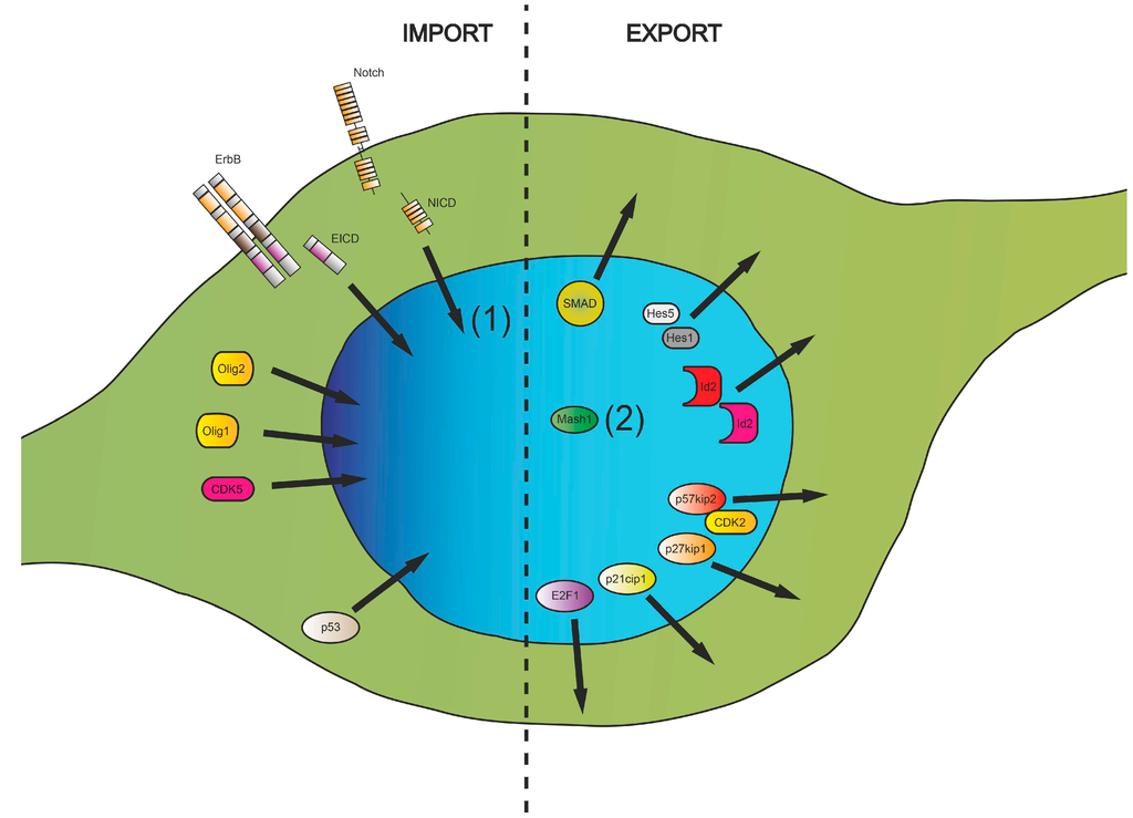 Summary of intracellular translocation directions of selected key proteins involved in transcriptional regulation, cell cycle control and transmission of cell surface signals revealed to be important for differentiation of immature oligodendroglial cells. (1) Nuclear import of Notch intracellular domain (NICD) was shown to have a different impact on the differentiation process depending on the nature of Notch ligands (Jagged1, F3/contactin); (2) The Mash1 protein is not exported from the nucleus; however, its inhibitory binding partner p57kip2 is actively translocated during the differentiation process thereby allowing Mash1 dependent transactivation of target genes to occur.