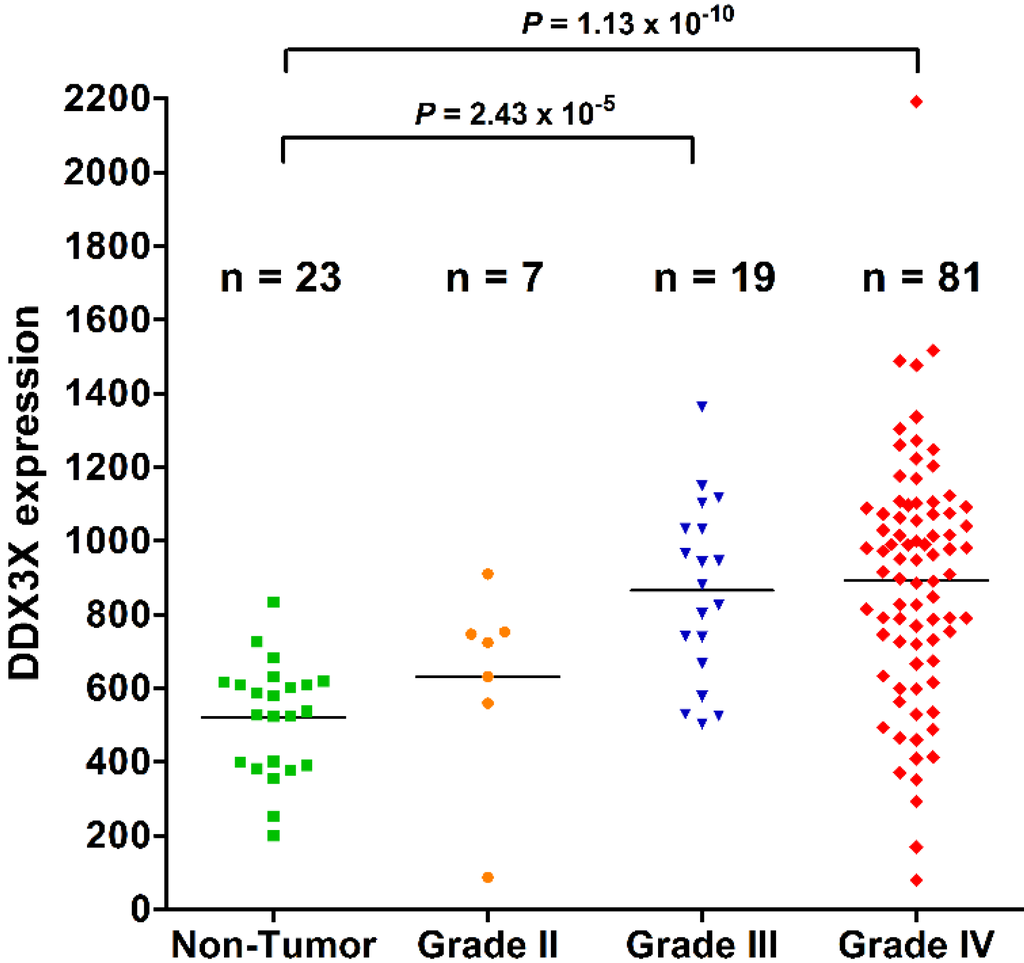The present studies suggest that DDX3X expression is significantly higher in patients with high-grade gliomas than in those with non-tumor brain controls and low-grade gliomas. High DDX3X expression is also associated with poor survival outcome. Molecular studies including qRT-PCR, Western blotting, and IHC staining further confirmed that DDX3X is over expressed in high-grade gliomas. This is the first study to establish the correlation between DDX3X biomarker with clinical outcome, and WHO pathological grading in human gliomas. Since the therapeutic outcome of GBM is not satisfactory, DDX3X provides one of the candidates for clinicians to choose biomarker to evaluate the survival outcome of patients with GBM stratified by the DDX3X expression in high-grade gliomas.