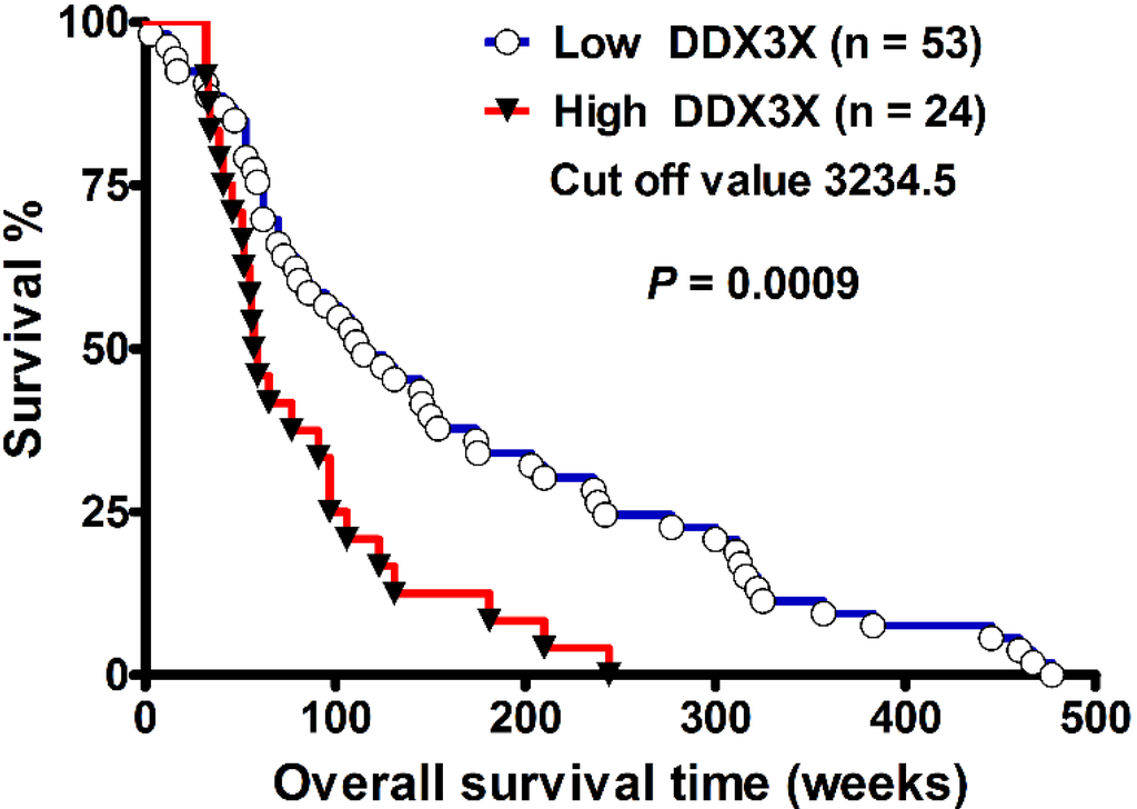DDX3X expression correlates with poor survival in high-grade gliomas. The Kaplan–Meier survival curve demonstrated poor survival in those with high DDX3X (>3234.5) (n = 24) compared to those with low DDX3X (<3234.5) (n = 53) expression levels (median survival, 115 vs. 58 weeks, p = 0.0009, by log-rank test, hazard ratio: 0.3507, 95% CI: 0.1893–0.6496).