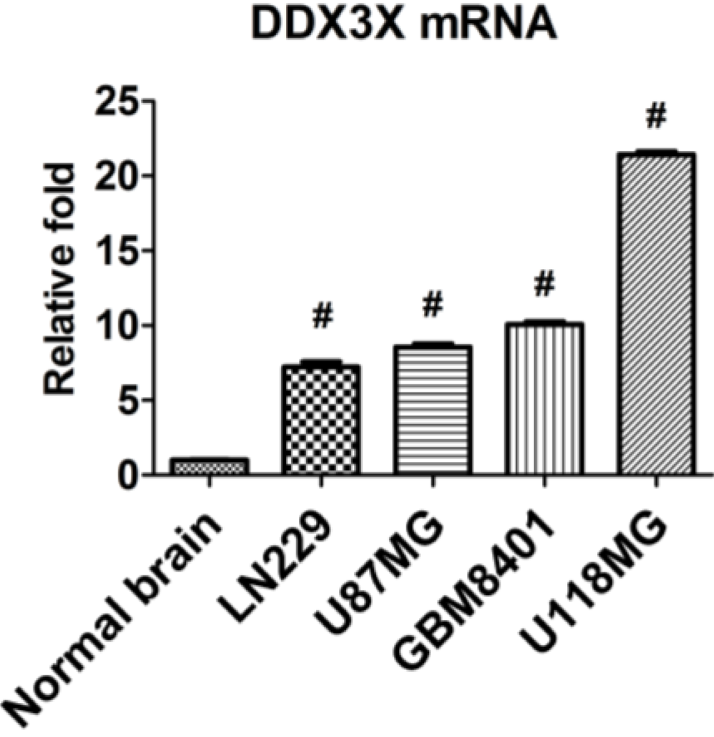 Expression of DDX3X mRNA in glioma cell lines and normal brain tissue. qRT-PCR was performed to examine DDX3X mRNA expression and the quantitative results are shown. The relative expressions were normalized with normal brain. Bars, mean ± SEM; # p < 0.001 showed significant differences. Data are representative of three independent experiments.