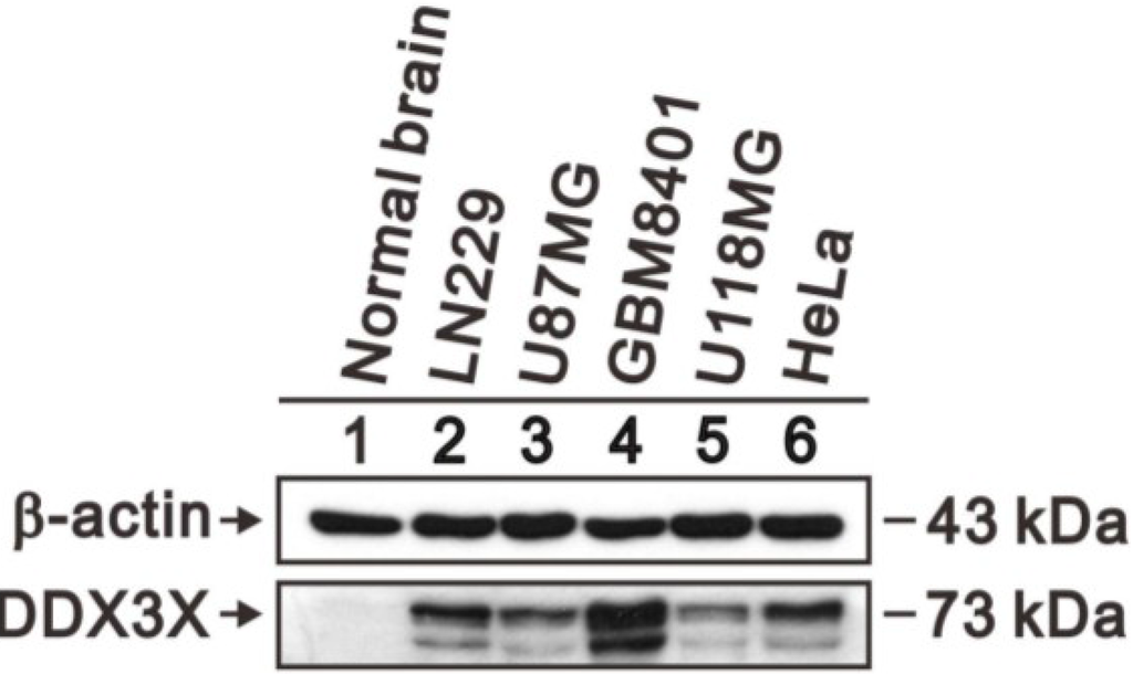 Expression of DDX3X protein in human glioma cell lines and normal brain tissue. Protein lysates of glioma cell lines, including LN229, U87MG, GBM8401 and U118MG, were applied to SDS-PAGE and Western blot analysis to quantitate DDX3X protein expression. HeLa cell was a positive control of DDX3X protein. β-actin served as a loading control.