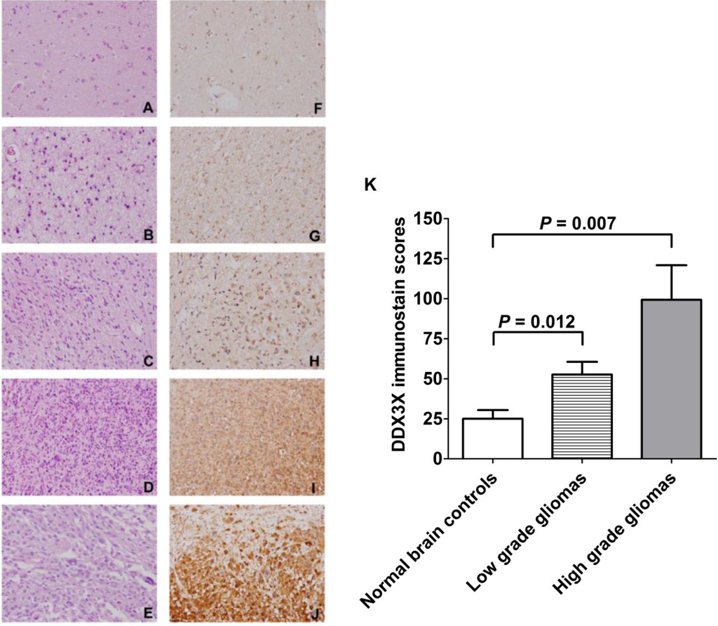 Hematoxylin and eosin staining of non-tumor brain tissue (A); pilocytic astrocytoma (B); diffuse astrocytoma (C); WHO grade III anaplastic astrocytoma (D); WHO grade IV glioblastoma multiforme (E); and IHC staining of DDX3X in non-tumor brain tissue (F); pilocytic astrocytoma (G); diffuse astrocytoma (H); anaplastic astrocytoma (I); and glioblastoma multiforme (J). Original magnification ×400; and (K) The DDX3X immunostain scores in normal brain tissue, low-grade glioma and high-grade glioma were statistically analyzed. The adjusted p value was calibrated between each group.