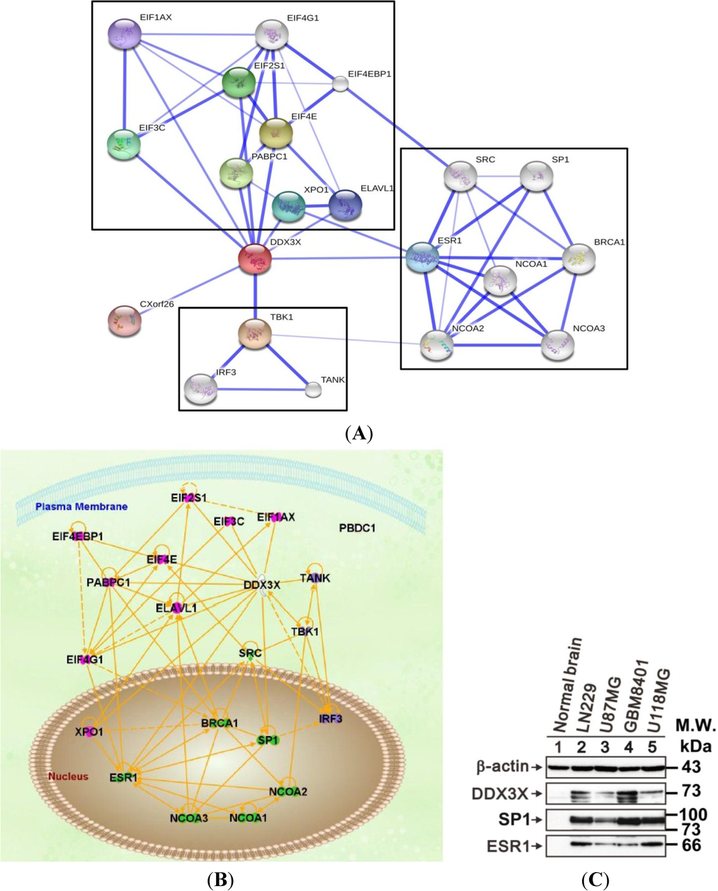 The protein–protein interaction (PPI) network and ingenuity pathway analysis (IPA). (A) The PPI network, as shown in the confidence view, created by the STRING database. DDX3X is controlling hub, and black squares show the protein clusters; (B) The IPA predicted signaling pathways transcriptionally regulated through DDX3X; and (C) The DDX3X-regulated genes including ESR1, and transcription factor SP1 were validated in normal brain tissue and human glioma cell lines. Protein lysates of glioma cell lines including LN229, U87MG, GBM8401 and U118MG were applied to SDS-PAGE and Western blot analysis to quantitate DDX3X, ESR1, and SP1 protein expression. These results are representative of two independent experiments. β-actin served as a loading control.