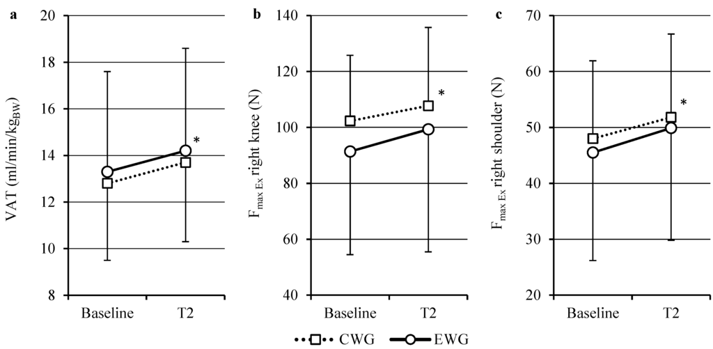 | VAT (W) | 51.0 ± 23.4 | 55.8 ± 24.8 | 50.5 ± 23.1 | 57.6 ± 25.5 | <0.01 | 0.26 | 0.39 |