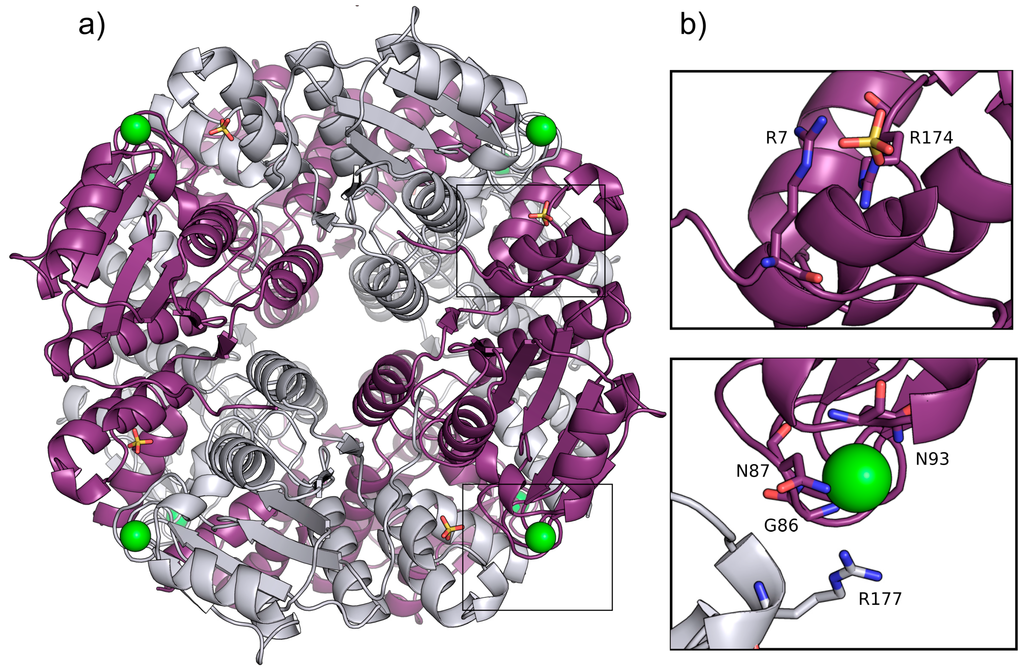 (a) Ribbon representation of P. aeruginosa YcaC octamer in crystal form I with chains alternately colored purple and silver, chloride as green spheres and sulfate as sticks with orange sulfur and red oxygens; (b) Close-up of the sulfate and chloride binding sites in chain A shown in purple with chain B depicted in silver. Stacked Arg 7 and 174 with the sulfate are shown in ball-and-stick representation. The chloride is shown with coordinating residues Gly86, Asn87 and Asn93 and the lid-forming Arg177 from chain B.