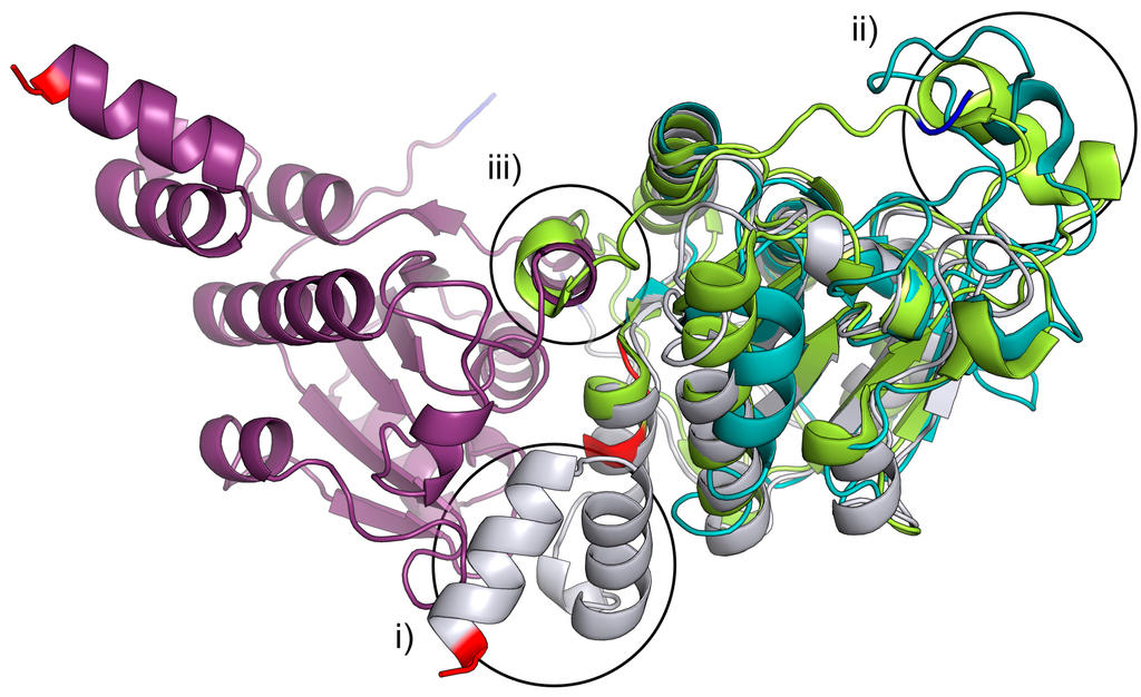 Ribbon representation of the least-squares superposition of chain A and B of Pa YcaC shown in purple and silver, the isochorismatase PhzD from P. aeruginosa (1NF9) [11] in lime and Mtb PncA (3PL1-a nicotinamidase) [12] in teal. N-terminal residues are colored blue, and C-terminal residues are colored red. (i) PhzD and PncA are both missing the YcaC C-terminal helices that form the active site with the neighboring chain; (ii) the large loop would prevent tetramerization if present in YcaC; (iii) as would the additional N-terminal helix present in PhzD. N- and C-termini are highlighted in blue and red, respectively.