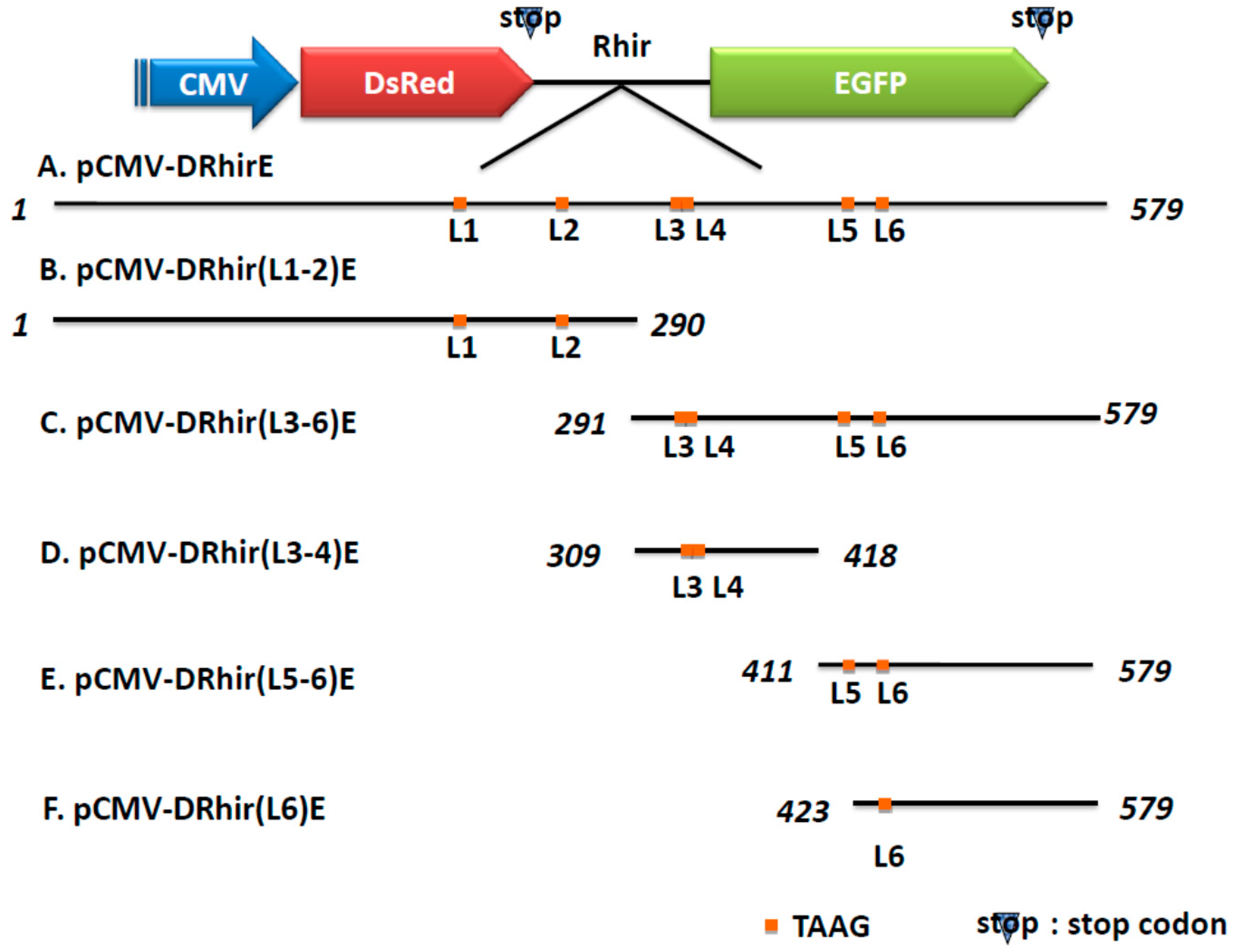 Schematic presentation of the truncated version of the RhPV 5′ IRES and bicistronic constructs. The indicated cDNA fragments were generated by PCR and inserted between the DsRed and EGFP genes in the bicistronic vector (A) pCMV-DRhirE which containing the completed 579 bps of RhPV IRES cDNA fragment and the six TAAG motifs are denoted with L1-6, respectively; (B) pCMV-DRhir(L1-2)E which containing the 1–290 bps of RhPV IRES cDNA fragment with the L1 and L2 TAAG motifs; (C) pCMV-DRhir(L3-6)E which containing the 291–579 bps of RhPV IRES cDNA fragment with the L3-L6 TAAG motifs; (D) pCMV-DRhir(L3-4)E which containing the 309–418 bps of RhPV IRES cDNA fragment with the L3 and L4 TAAG motifs; (E) pCMV-DRhir(L5-6)E which containing the 411–579 bps of RhPV IRES cDNA fragment with the L5 and L6 TAAG motifs; (F) pCMV-DRhir(L6)E which containing the 423–579 bps of RhPV IRES cDNA fragment with only the L6 TAAG motifs.
