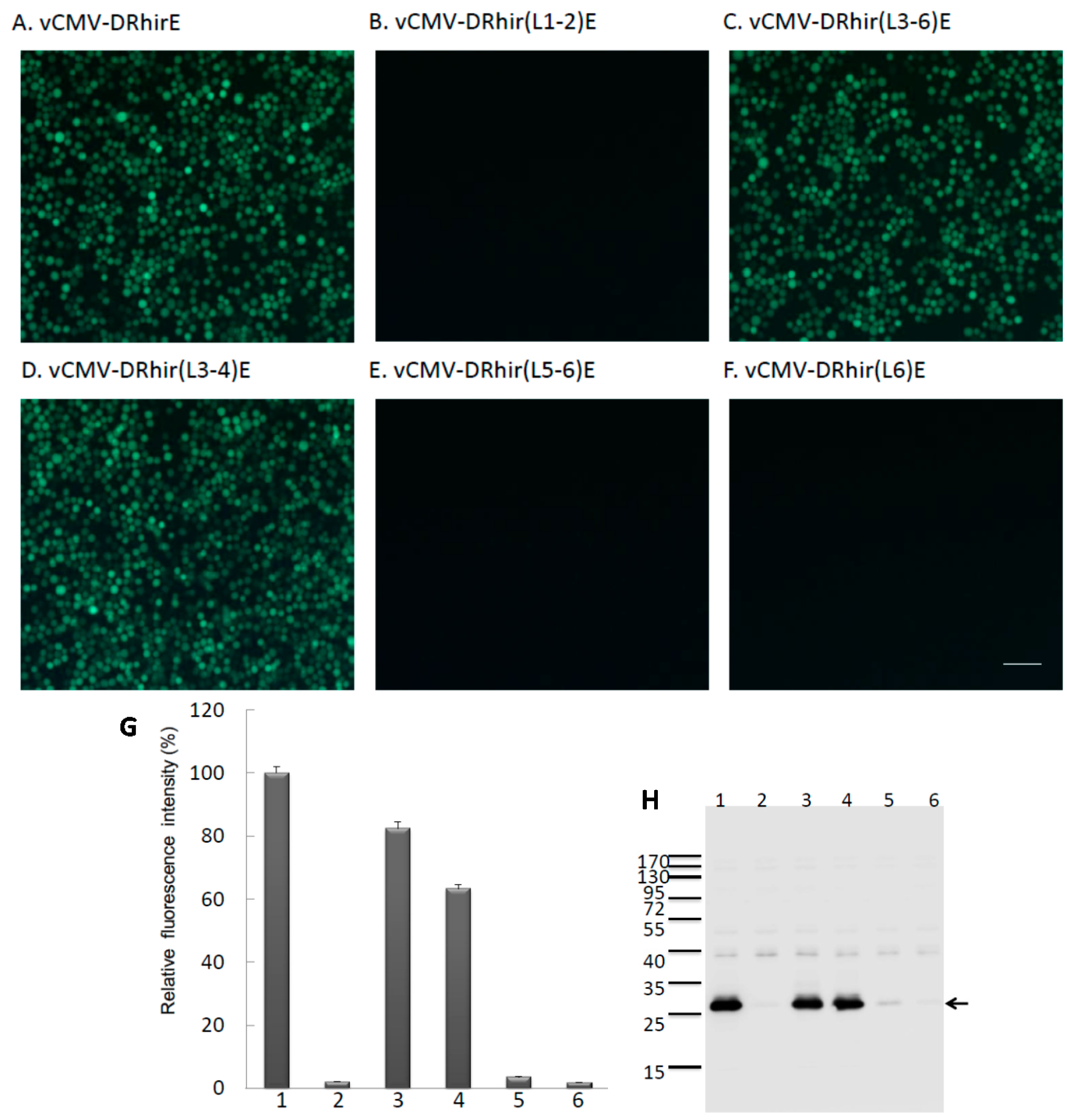 Identification of the TAAG motifs in the cDNA of RhPV 5′ IRES that are required for promoter activity in baculovirus infected Sf21 cells. Fluorescence micrographs of Sf21 cells infected with (A) vAcCMV-DRhirE (positive control); (B) vCMV-DRhir(L1-2)E; (C) vCMV-DRhir(L3-6)E; (D) vCMV-DRhir(L3-4)E; (E) vCMV-DRhir(L5-6)E or (F) vCMV-DRhir(L6)E at a multiplicity of infection of 1 at three days post-infection. Pictures were taken under a FITC channel with a 450/490-nm filter set using an exposure time of 900 ms; scale bar is 50 μm; (G,H) Quantitative analysis of promoter activity in the different TAAG motifs truncated cDNA fragments of RhPV 5′IRES by spectrofluorometer and Western blot; (G) Spectrofluorometric measurement of EGFP fluorescence in lysates (100 μL; 50 μg of protein) from Sf21 cells infected with (1) vAcCMV-DRhirE; (2) vCMV-DRhir(L1-2)E; (3) vCMV-DRhir(L3-6)E; (4) vCMV-DRhir(L3-4)E; (5) vCMV-DRhir(L5-6)E or (6) vAcCMV-DRhir423E. EGFP fluorescence emission was excited at 488 nm and monitored at 507 nm. The fluorescence intensity of EGFP was normalized to that of vAcCMV-DRhirE infected Sf21 cell lysates (100%); (H) Western blot analysis of cellular lysates from Sf21 cells infected with vAcCMV-DRhirE (Lane 1), vCMV-DRhir(L1-2)E (Lane 2), vCMV-DRhir(L3-6)E (Lane 3), vCMV-DRhir(L3-4)E (Lane 4), vCMV-DRhir(L5-6)E (Lane 5) or vCMV-DRhir(L6)E (Lane 6). Proteins (25 μg per lane) were separated by 12% SDS–PAGE and then electrotransferred onto PVDF membranes, which were then incubated with rabbit anti-GFP polyclonal antibody followed by an HRP-conjugated goat anti-rabbit secondary antibody. Detected protein bands were visualized on X-ray film using a Western blot chemiluminescence kit. Molecular mass markers (kDa) are indicated at left and the arrow indicated the EGFP protein band.