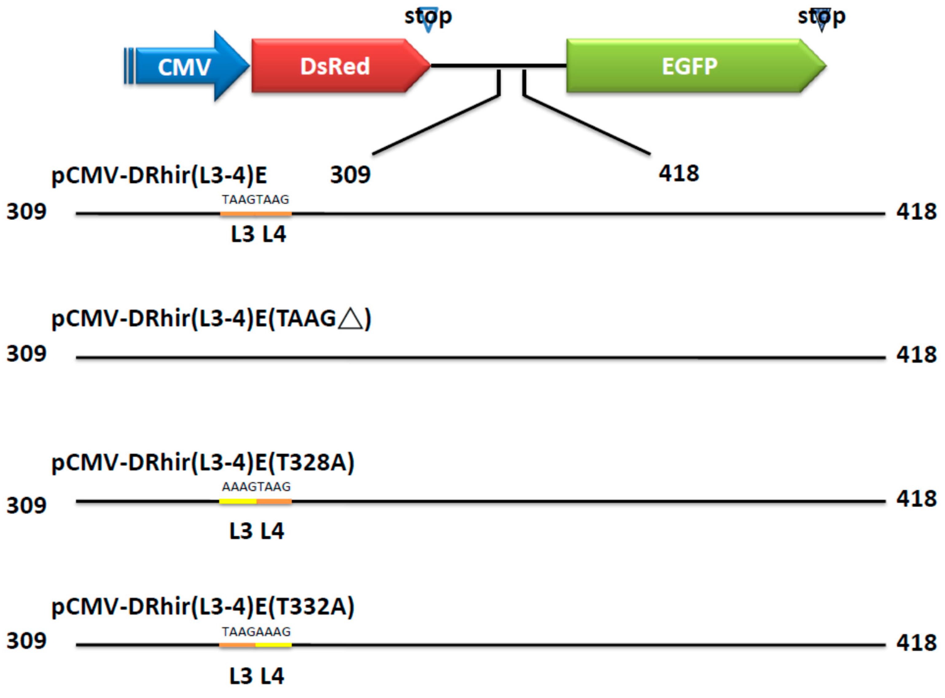 Schematic presentation of the truncations and mutations in the RP110 cryptic promoter. The indicated cDNA fragments were generated by chemical synthesis and inserted between the DsRed and EGFP genes in the bicistronic vector pCMV-DRhir(L3-4)E which containing the 309–418 bps of RhPV IRES cDNA fragment and the two tandem repeated TAAG motifs L3 and L4. pCMV-DRhir(L3-4)E (TAAG∆) indicated the L3 and L4 TAAG were deleted. pCMV-DRhir(L3-4)E (T328A) denoted the 328th nucleotide T was change to A and pCMV-DRhir(L3-4)E (T332A) denoted the 332th nucleotide T was changed to A.