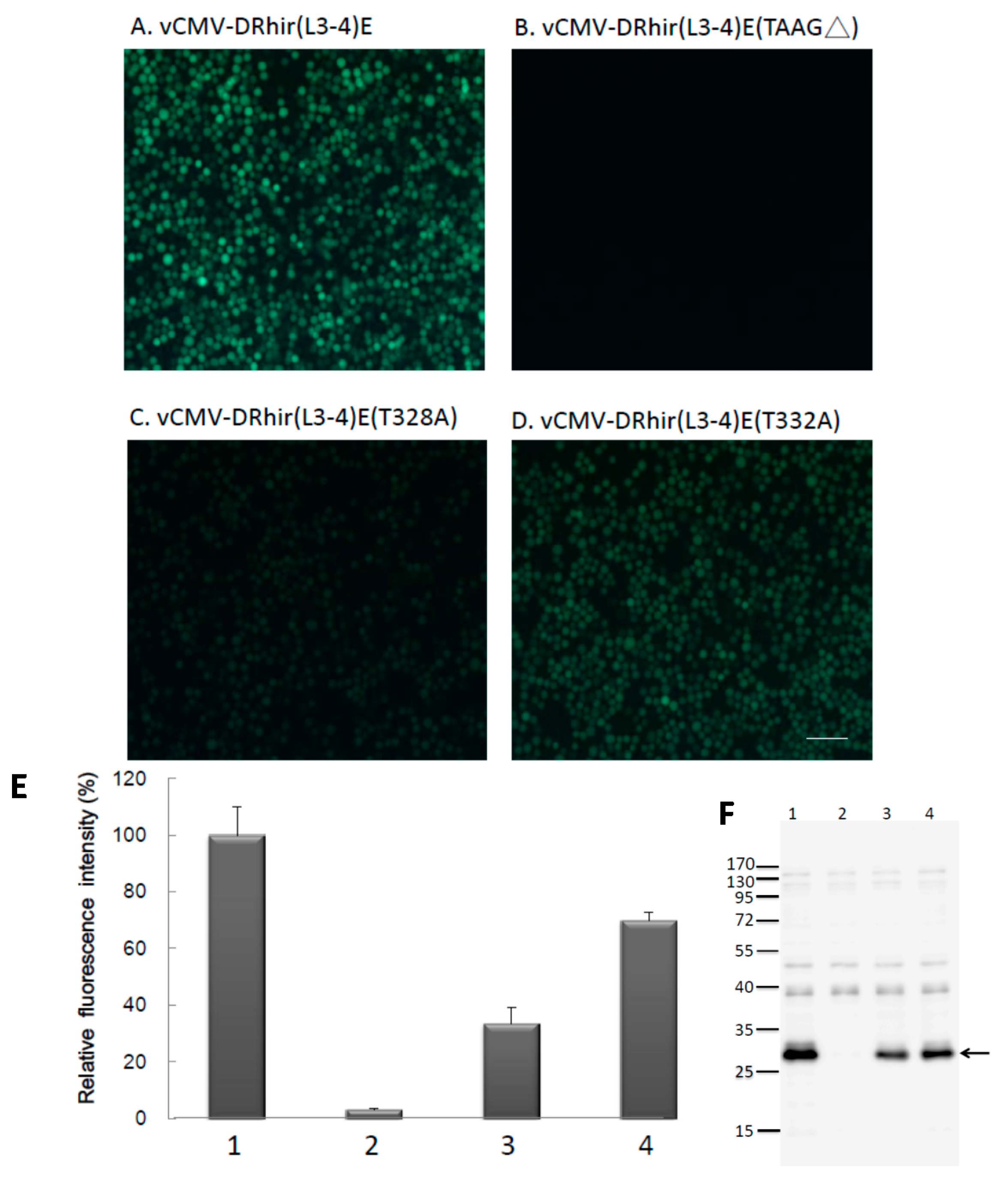 The vCMV-DRhir(L3-4)E (TAAG∆) infected Sf21 cells did not emit any green fluorescence (Figure 4B), which is contrast to the vCMV-DRhir309E infected Sf21 cells (Figure 4A). This result indicated the L3, L4 tandem repeat TAAG motifs in the cDNA of RhPV IRES is necessary and sufficient enough to be a cryptic promoter in baculovirus infected Sf21 cells. Further investigation was directed to differentiate which of the L3 and L4 TAAG motifs is more important for the cryptic promoter activity. In this regard, two plasmids, in which a single mutation in either L3 or L4 were constructed without changing the size of RP110 promoter. Specifically, in pCMV-DRhir(L3-4)E (T328A), T at position 328 was mutated to A in L3; whereas in pCMV-DRhir(L3-4)E(T332A), T at position 332 was mutated to A in L4 (Figure 3). The corresponding recombinant viruses generated therefrom were named vCMV-DRhir(L3-4)E(T328A) and vCMV-DRhir(L3-4)E(T332A), respectively. Interestingly, both vCMV-DRhir(L3-4)E(T328A) and vCMV-DRhir(L3-4)E(T332A) infected Sf21 cells emitted the green fluorescence (Figure 4C,D).