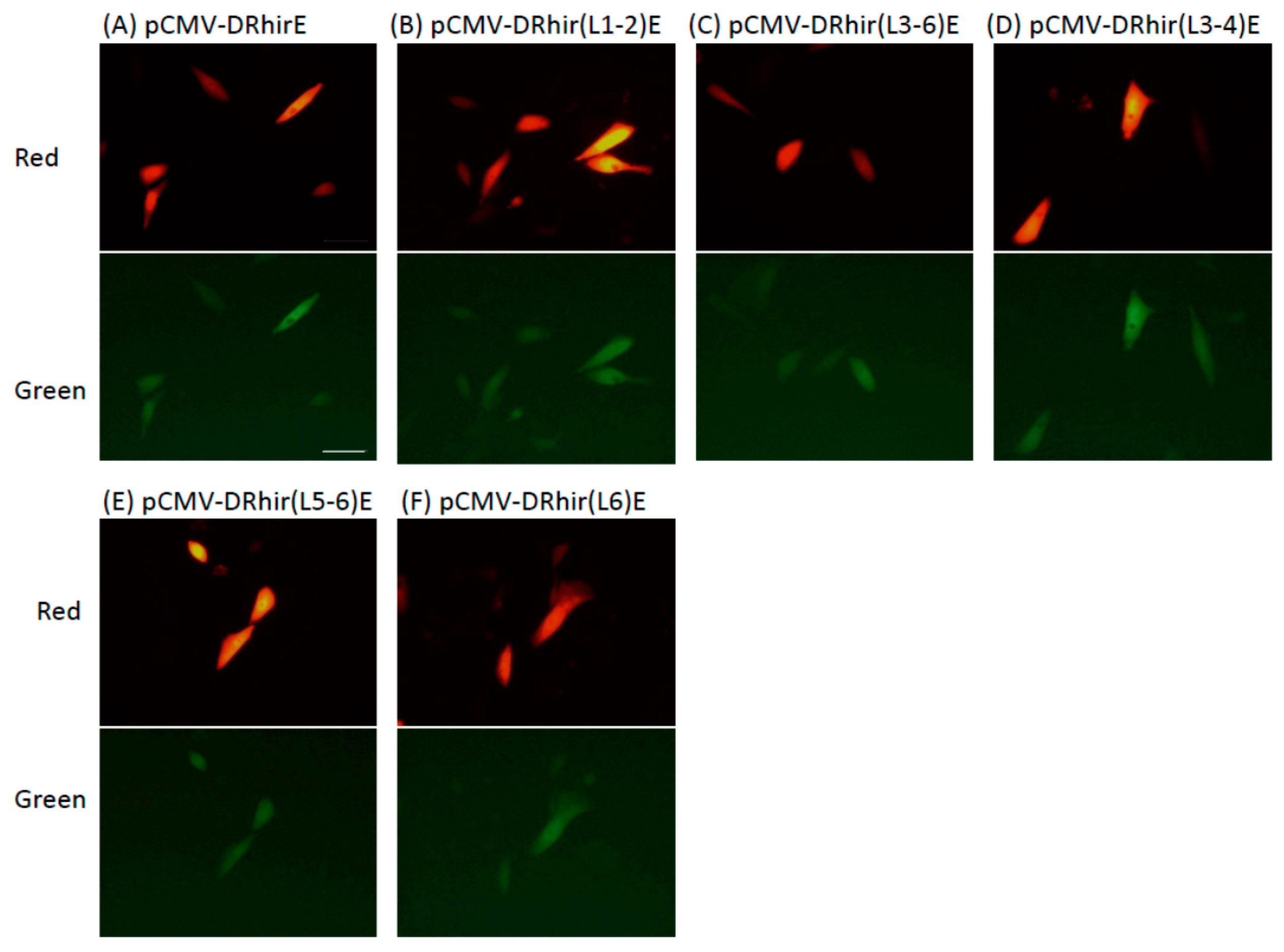 The truncated RhPV 5′UTR IRES element fragments displayed internal translational activity in mammalian cells. CHO cells (5 × 104 cells per well, seeded in a 24-well plate) were transfected with pCMV-DRhirE (A); pCMV-DRhir(L1-2)E (B); pCMV-DRhir(L3-6)E (C); pCMV-DRhir(L3-4)E (D); pCMV-DRhir(L5-6)E (E) or pCMV-DRhir(L6)E (F) and observed at two days after transfection under fluorescence microscopy. Pictures were taken in the same field using a conventional rhodamine channel (Red) with a 510/560-nm filter set and a FITC channel (Green) with a 450/490-nm filter set. All pictures were taken with the same exposure time (900 and 400 ms for EGFP and DsRed, respectively). Scale bar is 50 μm.