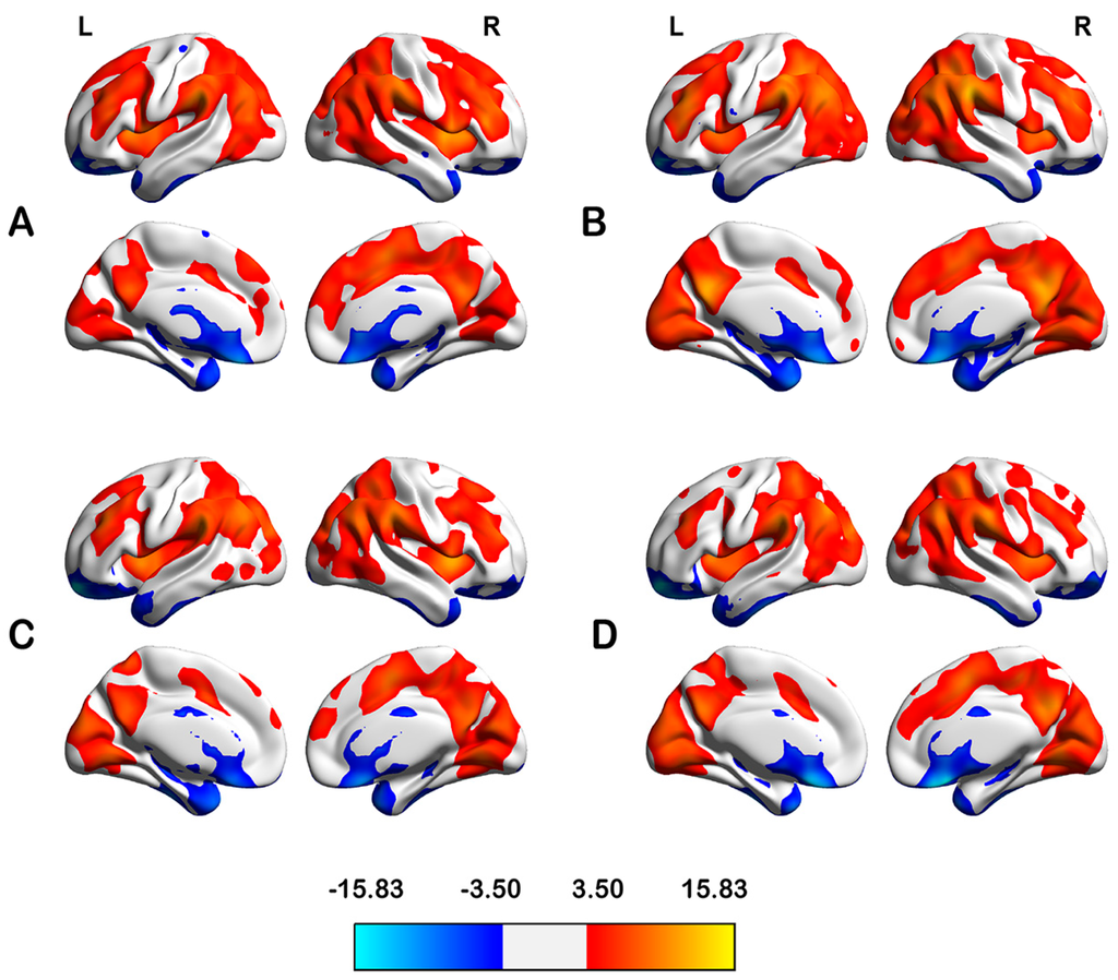Degree centrality (DC) maps within groups of male HC (HCm) (A); male FES (FESm) (B); female HC (HCf) (C) and female FES (FESf) (D), the color bars represent the t-values of one sample t-test in DC maps. FES, first episode schizophrenia patients; HC, healthy controls; L, left hemisphere; R, right left hemisphere.