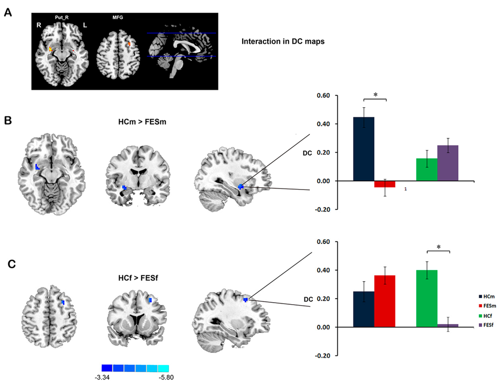 Sex by diagnosis interaction in DC maps. Significant sex by diagnosis interaction was found in right putamen (Put_R) and left middle frontal gyrus (MFG) (A); Simple effect analysis suggested that male FES patients showing selective DC reduction in Put_R (B); while female patients showing selective DC reduction in MFG (C). The color bars represent the t-values in post hoc comparisons. The bar chart indicates the average z-transformed DC of ROIs (Region of interest) for each group. * Represent a significant difference detected. L, left hemisphere; R, right left hemisphere.