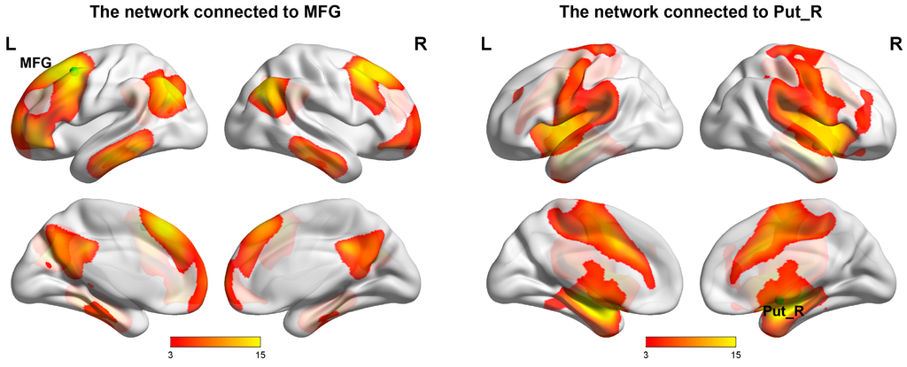 The Put_R and MFG were selected as seeds for network analysis. Figure 3 illustrates the networks linked to each of the seeds in healthy controls. Interestingly, the MFG and Put_R were components of two separated networks. Similar networks could be reconstructed in all four groups of this study, despite some differences in strength (Please see Figures S5 and S6).