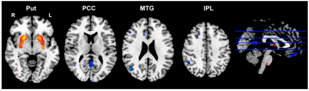 The MFG-related network was similar to the previously described default mode network (DMN) []; brain regions in this network included IPL, PCC, medial prefrontal cortex (MPFC) (including the MFG cluster) and inferior temporal gyrus. The Put_R-related network was similar to the previously reported sensorimotor network (SMN) [,]; which included the primary and supplementary motor cortices, sensorimotor cortices, middle cingulate gyrus, striatum (including the Put_R cluster), middle-posterior insula and cerebellum (Please see also Figure S7 for superimposed maps of the “MFG-related network” and “Put_R-related network” with canonical SMN and DMN).