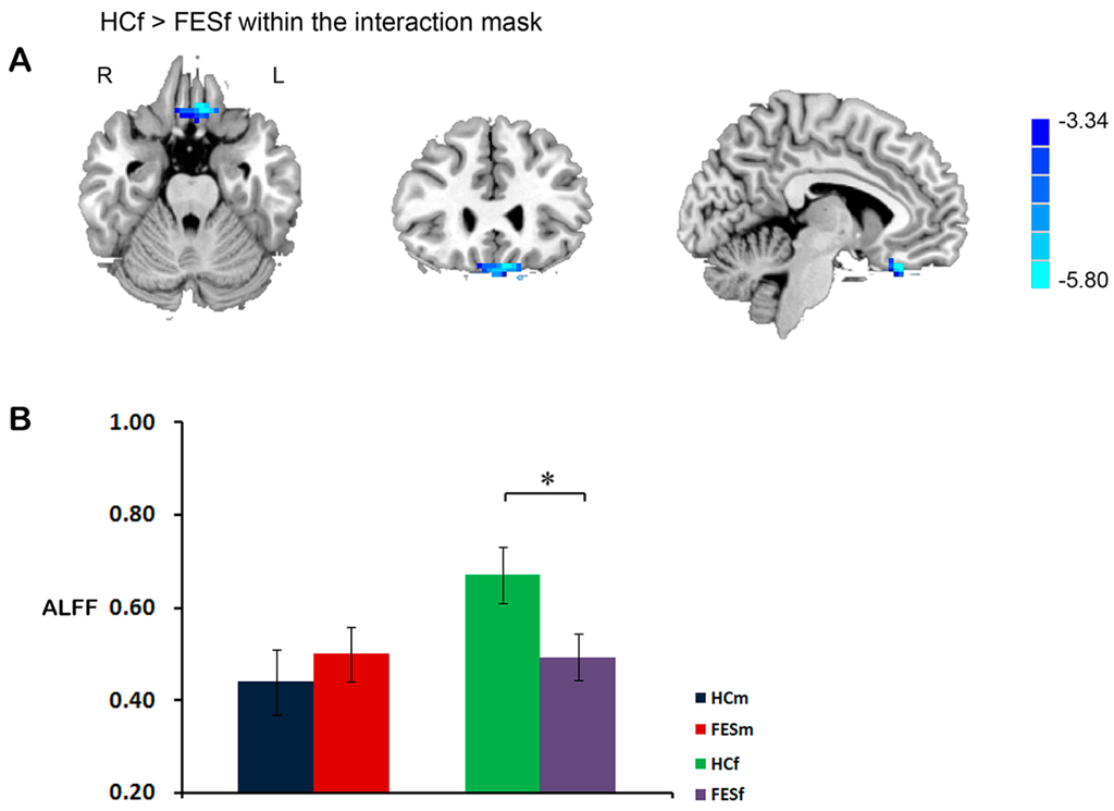 Female FES patients showing selective ALFF reduction in ventral medial frontal gyrus (vmPFC). The cluster was identified using two-sample t-test, HCf vs. FESf, within a mask that showing significant sex by diagnosis interaction (A); The bar chart indicates the average z-transformed ALFF of vmPFC for each group (B). * Represents a significant difference was detected.