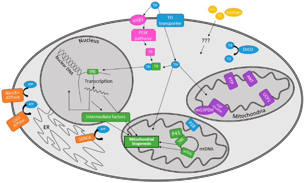 In addition to the effects described above, TH exerts actions in/on mitochondria [51]. Aside from the nuclear genomic-based pathway of mitochondrial biogenesis, TH also induces mitochondrial genome transcription [25]. TH promotes mitochondrial genome transcription via two distinct mechanisms: directly by binding within the mitochondria to activate transcription machinery, and indirectly by binding to TR nuclear receptors which induce the expression of intermediate factors, which then go on to mitochondria and induce mitochondrial genome-specific gene expression (reviewed by [25] and discussed further in Section 3.2.3 below).