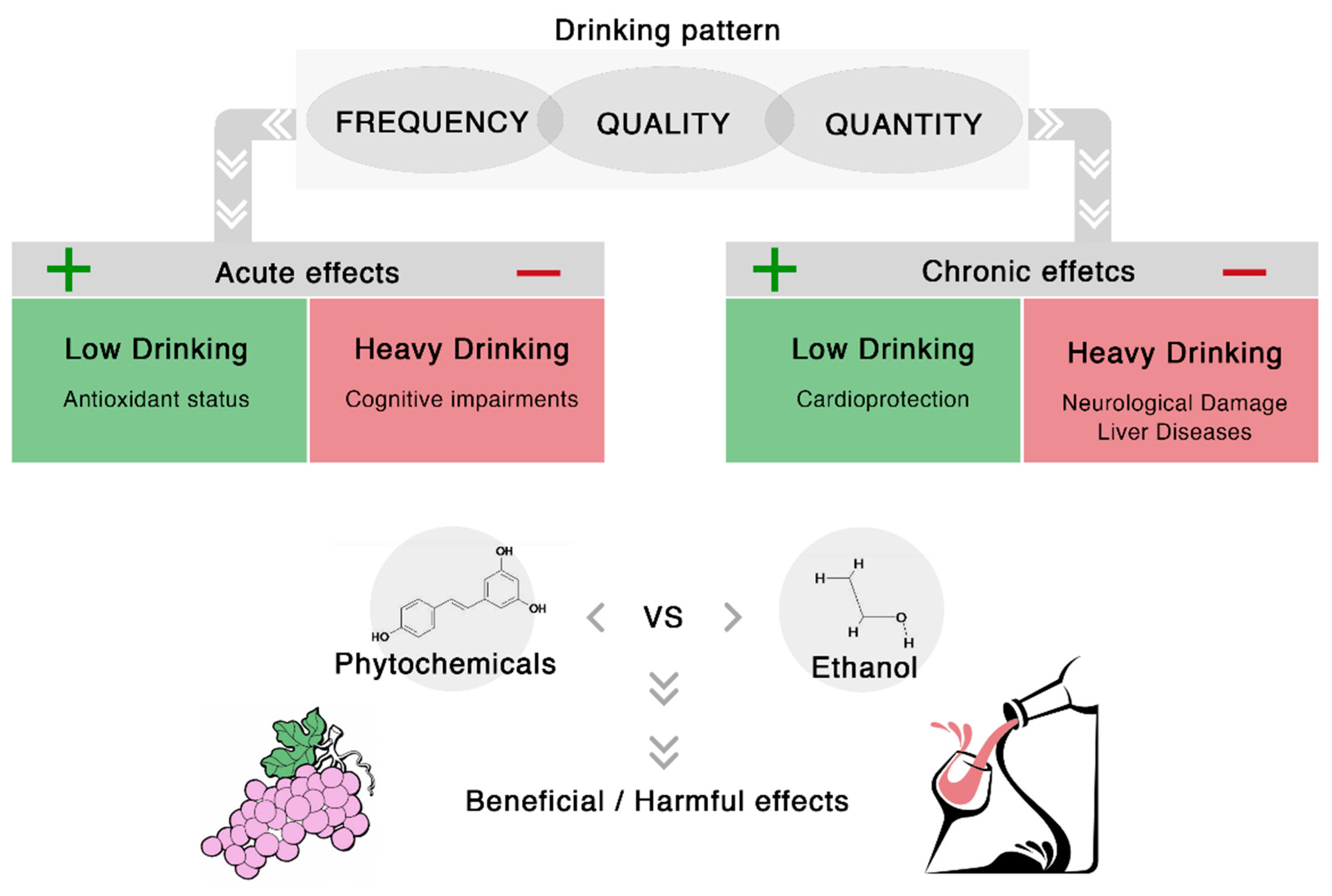 From the French paradox to date, a rising body of evidences reported health-promoting effects related to the habitual, low to moderate red wine intake at main meals [6,18]. Systematic reviews and meta-analyses supported, tough not unquestionably, that this nutritional habit may be protective against certain cardiovascular diseases, reducing morbidity and mortality rates [19,20]. The rationale is based on the high content of a variety of beneficial bioactive compounds, namely phytochemicals, contained in wine [21]. On other hand, the heavy wine intake (at least more than three drinks/day) has been strongly associated with a dose-dependent risk of liver diseases, such as fatty liver, cirrhosis and hepatic carcinoma, certain types of cancer, and brain damage, mainly cognitive function impairment [5,22,23] (Figure 1). Therefore, two cornerstones should be taken into account in patient risk analysis: (i) the individual drinking pattern; and (ii) the dietary habits.
