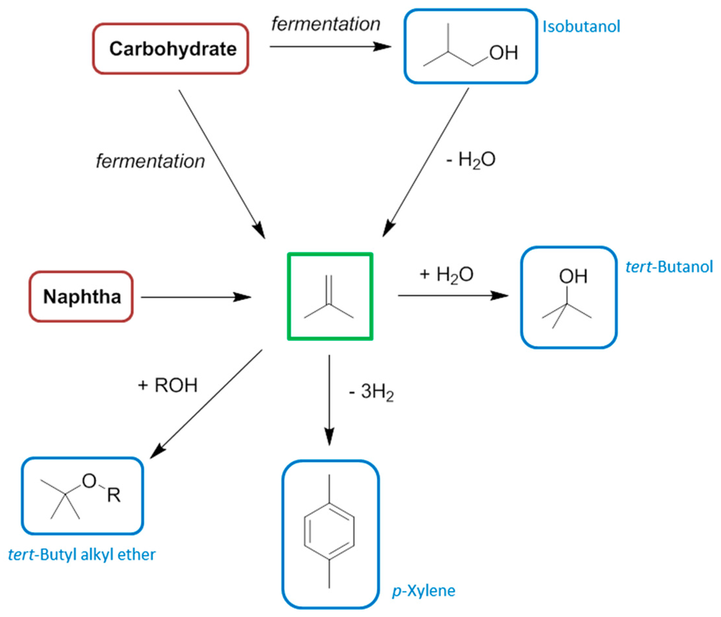 - Peters, M.W.; Taylor, J.D.; Jenni, M.; Manzer, L.E.; Henton, D.E. Integrated Process to Selectivity Convert Renewable Isobutanol to p-Xylene. US Patent 0087000 A1, 14 April 2011. [Google Scholar]