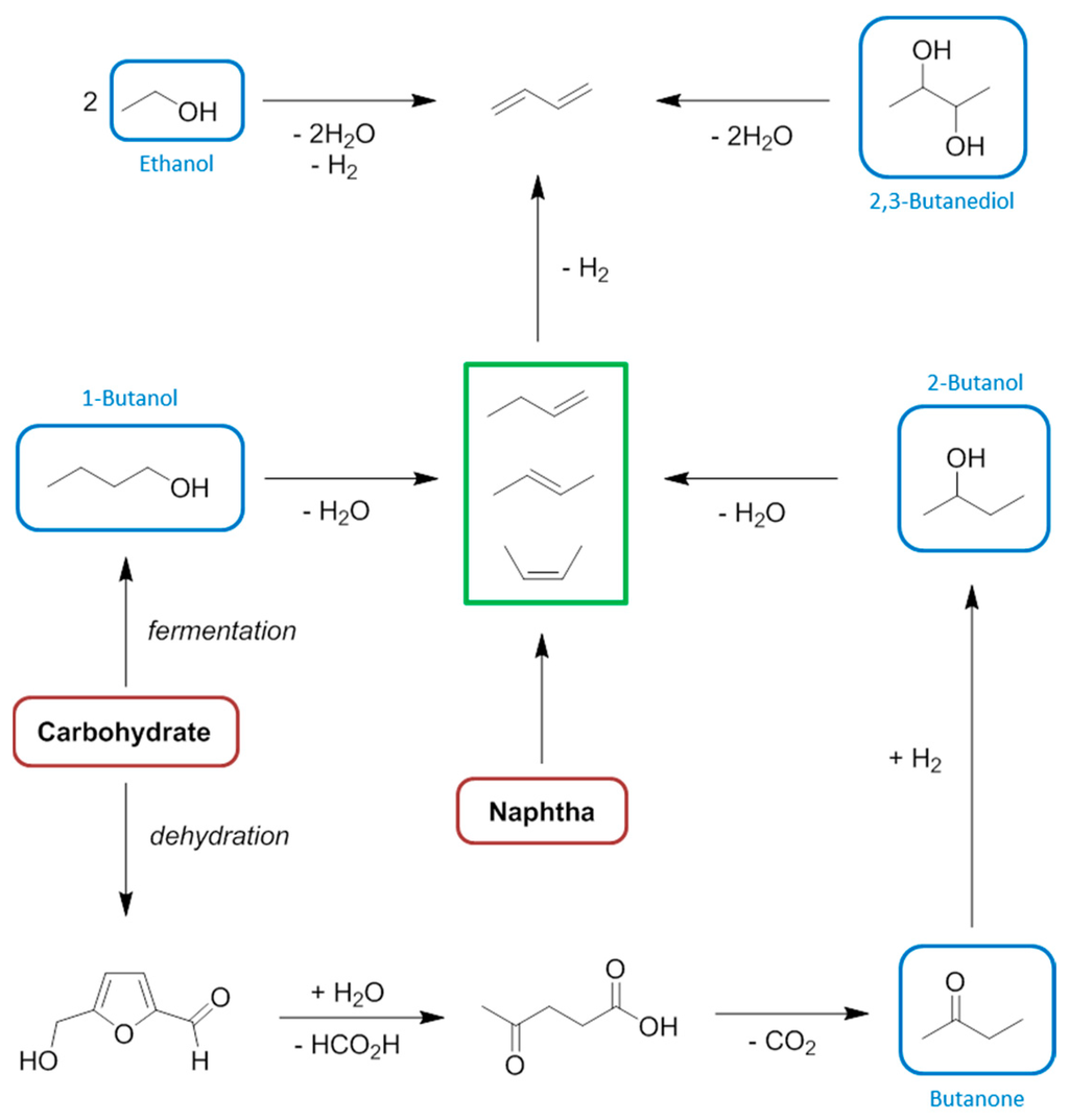 - Angelici, C.; Weckhuysen, B.M.; Bruijnincx, P.C.A. Chemocatalytic conversion of ethanol into butadiene and other bulk chemicals. ChemSusChem 2013, 6, 1595–1614. [Google Scholar] [CrossRef] [PubMed]
