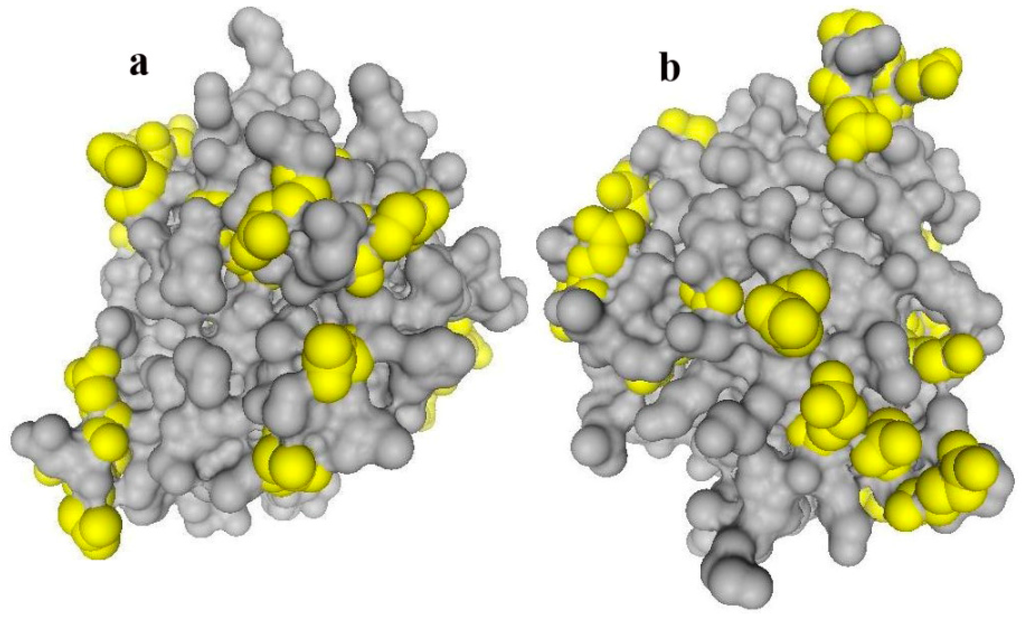 Distribution of carboxylic residues (yellow) on the BLG surface (PDB number: 3BLG) from two rotational views (a,b). This figure is generated by using the software of Swiss-PdbViewer version of 4.1.