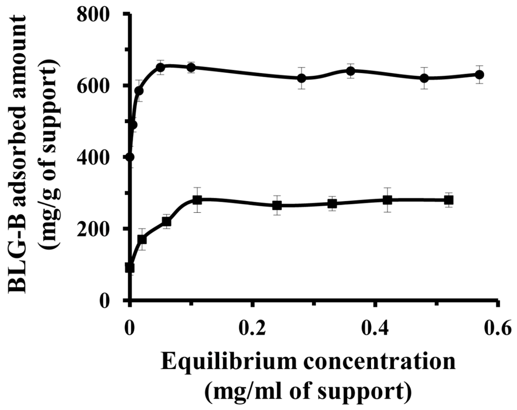 | Supports | Pore Size (nm) | BLG Adsorbed (%) | BLG Leached (%) |