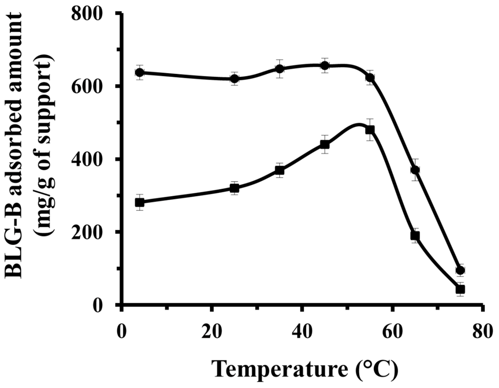 Heat stress can induce conformational change of proteins and therefore influence their adsorption behaviors onto the solid supports. Hence, the effect of elevation of medium temperature (from 4 to 75 °C) on immobilization of BLG-B onto the modified and unmodified KIT-6 was investigated. Figure 3 shows the immobilized content of BLG-B on the non-functionalized KIT-6 increases dramatically with raising temperature from 4 to 55 °C (from 281 mg/g of support at 4 °C to 480 mg/g of support at 55 °C), while varying temperature does not bring any changes in immobilization amount of BLG-B on the [n-PrNH2-KIT-6]. These observations may indicate that the BLG-B concentrations selected for this experiment did not saturate the surface of KIT-6 and that the interfaces were probably exposed after raising temperature.