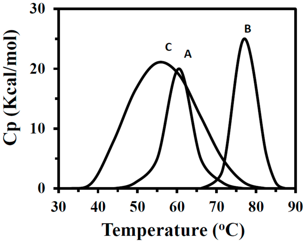Thermal unfolding processes in free and immobilized BLG-B were followed by DSC technique. Analysis of DSC profile of BLG-B-[n-PrNH2-KIT-6] demonstrated a sharper thermal profile (homogeneous population of BLG-B) with a 54.7 kcal/mol enthalpy value compared to that of the free BLG-B (with the value of 37.5 kcal/mol) and BLG-B-KIT-6 (with the value of 173.5 kcal/mol). The transition points (Tm) of the free and immobilized BLG-B onto the KIT-6 and [n-PrNH2-KIT-6] were 60.5, 55 and 77 °C, respectively (Figure 4, Table 2). The heterogeneity of protein population can be determined by the value of enthalpy.