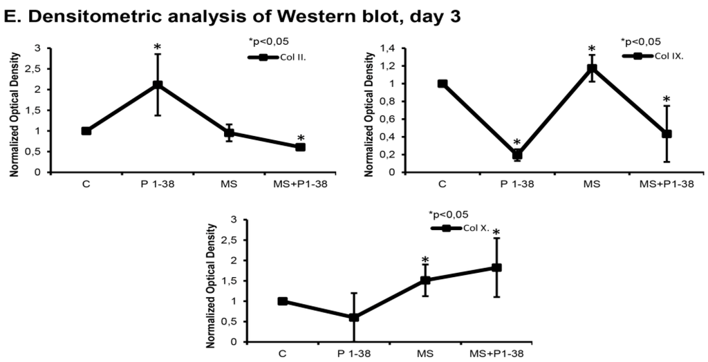 PACAP and/or mechanical load altered the collagen production of HDC. PACAP 1–38 at 100 nM was applied continuously from day one. Short time, transient MS, was applied on days two and three for 30 min on both days. (A) Collagen production of HDC was determined by 3H-collagen incorporation; (B) RNA expression of collagen type II (Col2a1), collagen type IX (Col9a1) and collagen type X (Col10a1) on day three. GAPDH was used as a control; (D) Protein expression of collagen type II, collagen type IX, collagen type X on day three. Actin was used as a control. For panels (B,D) numbers below signals represent integrated densities of signals determined by ImageJ software. Representative data of three independent experiments are shown; (C,E) Statistical analysis of RT-PCR and Western blot data. All data presented are the averages of at least three different experiments. Statistical analysis was performed by Student’s t-test. All data were normalized on GAPDH/Actin and data are expressed as mean ± SEM. (C, control; P1–38, PACAP 1–38; MS; mechanical stimulus). Statistically significant difference between collagen production rate of cells in cultures that received the loading regime and/or PACAP 1–38 vs. control cultures is marked by asterisk (* p < 0.05) in all panels.