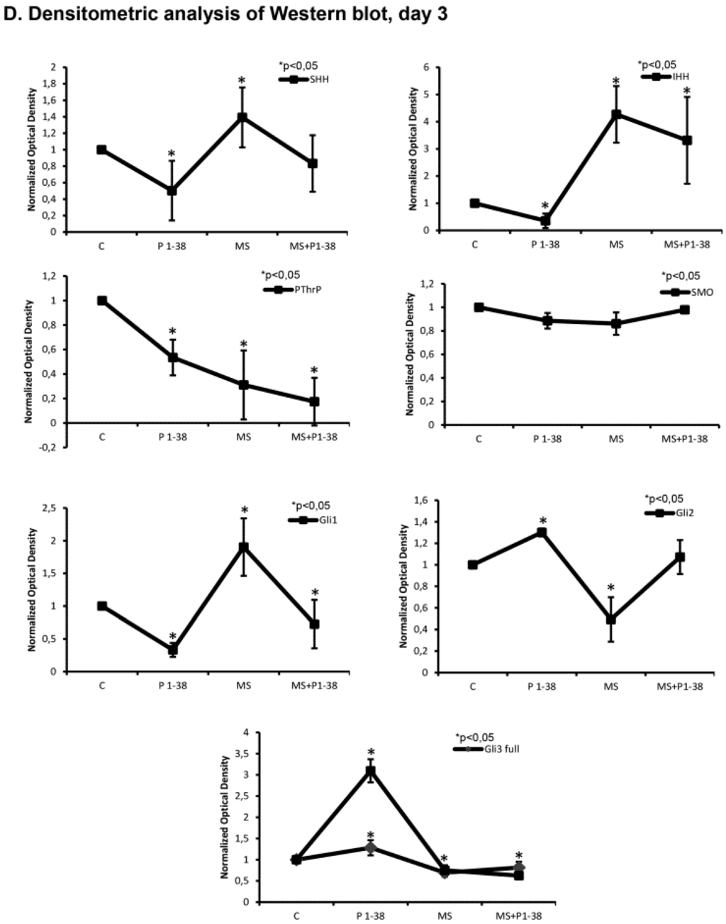 Effects of PACAP and/or mechanical stimulus on HH signaling of chondrofying cells. mRNA (A) and protein (C) expression of IHH, PTHrP, SHH, Smoothened (Smo), Gli1, Gli2 and Gli3 in HDC cultures on day three of culturing. For RT-PCR (A) reactions GAPDH and for Western blot (C) reactions Actin was used as control. Optical density of signals was measured and results were normalized to the optical density of controls. For panels (A,C) numbers below signals represent integrated densities of signals determined by ImageJ software. Representative results of three independent experiments are shown; (B,D) Statistical analysis of RT-PCR and Western blot data. All data are the average of at least three different experiments. Asterisks indicate significant (* p < 0.05) alteration of expression as compared to the respective control in all panels. Statistical analysis was performed by Student’s t-test. All data were normalized on GAPDH/Actin and data are expressed as mean ± SEM. (C, control; P1–38, PACAP 1–38; MS; mechanical stimulus).
