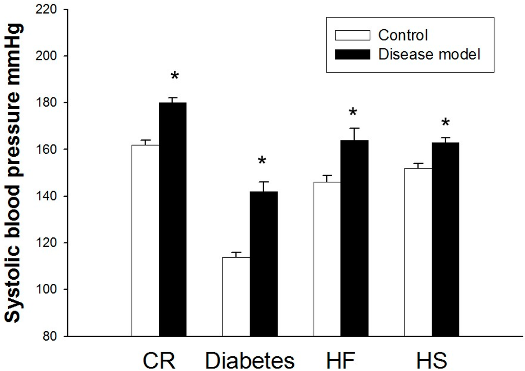 Data were represented as mean ± S.E.M. BP was analyzed by using the Student t-test to compare the disease model group with the respective control group. A p-value <0.05 was considered statistically significant. All analyses were performed using the Statistical Package for the Social Sciences software (SPSS, IBM, Armonk, NY, USA).