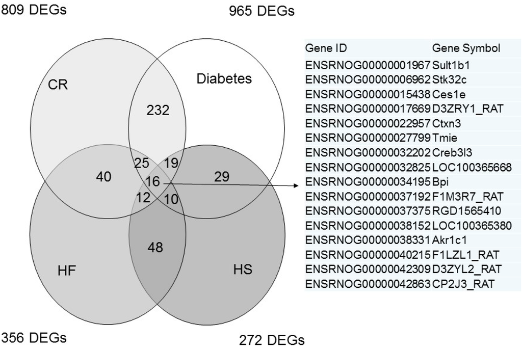 Venn diagram depicting unique and shared (overlapping circles) sets of differentially expressed genes (DEGs) in the kidney between CR, streptozotocin-induced diabetes, HF, and HS groups at two weeks of age. A total of 16 combined DEGs are listed in the right panel.