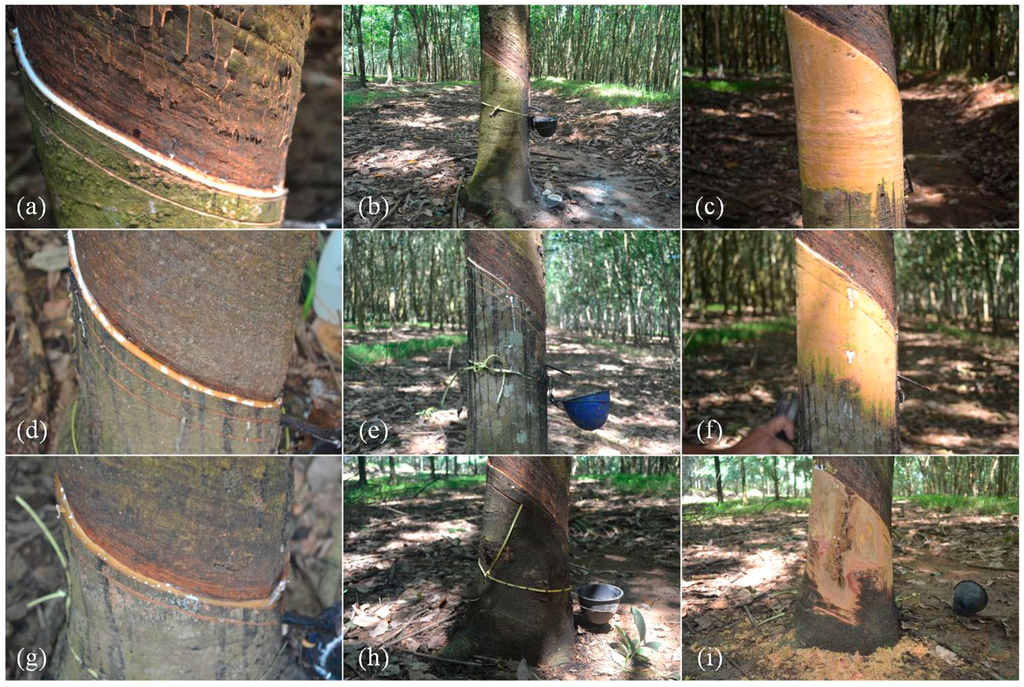 - Obouayeba, S.; Soumahin, E. Relationship between tapping intensity and tapping panel dryness susceptibility of some clones of Hevea brasiliensis in Southwestern Côte d’Ivoire. Agric. Biol. J. N. Am. 2011, 2, 1151–1159. [Google Scholar] [CrossRef]