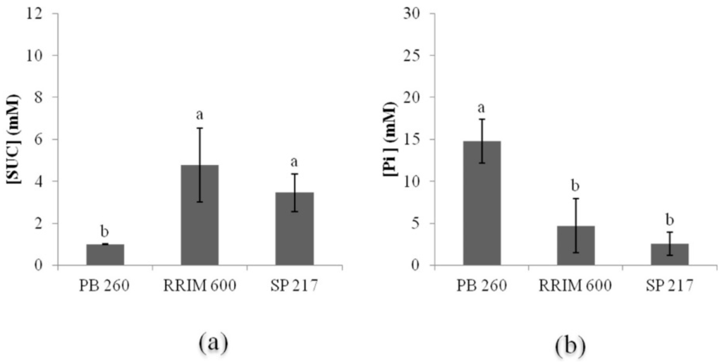 Metabolic typology for three rubber clones (PB 260, RRIM 600, and SP 217) with contrasted latex metabolism based on sucrose (SUC) and inorganic phosphorus (Pi) content in latex. The ANOVA test and the Newman–Keuls test were used in the statistical analyses (p < 0.05). (a) Sucrose content; (b) Inorganic phosphorus.