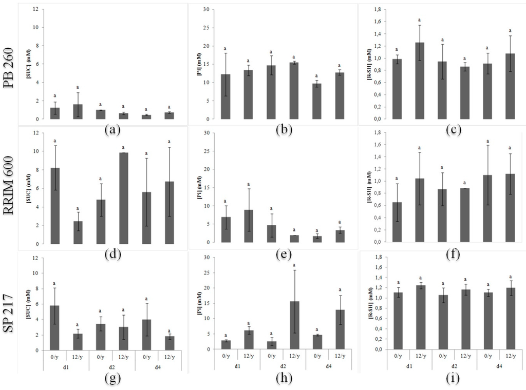 Sucrose (SUC; a, d, g), inorganic phosphorus (Pi; b, e, h) and thiol (R-SH; c, f, i) contents for three rubber clones (PB 260, RRIM 600, and SP 217) with contrasting latex metabolism 12 months after first tapping. The ANOVA test and the Newman–Keuls test were used in the statistical analyses (p < 0.05).