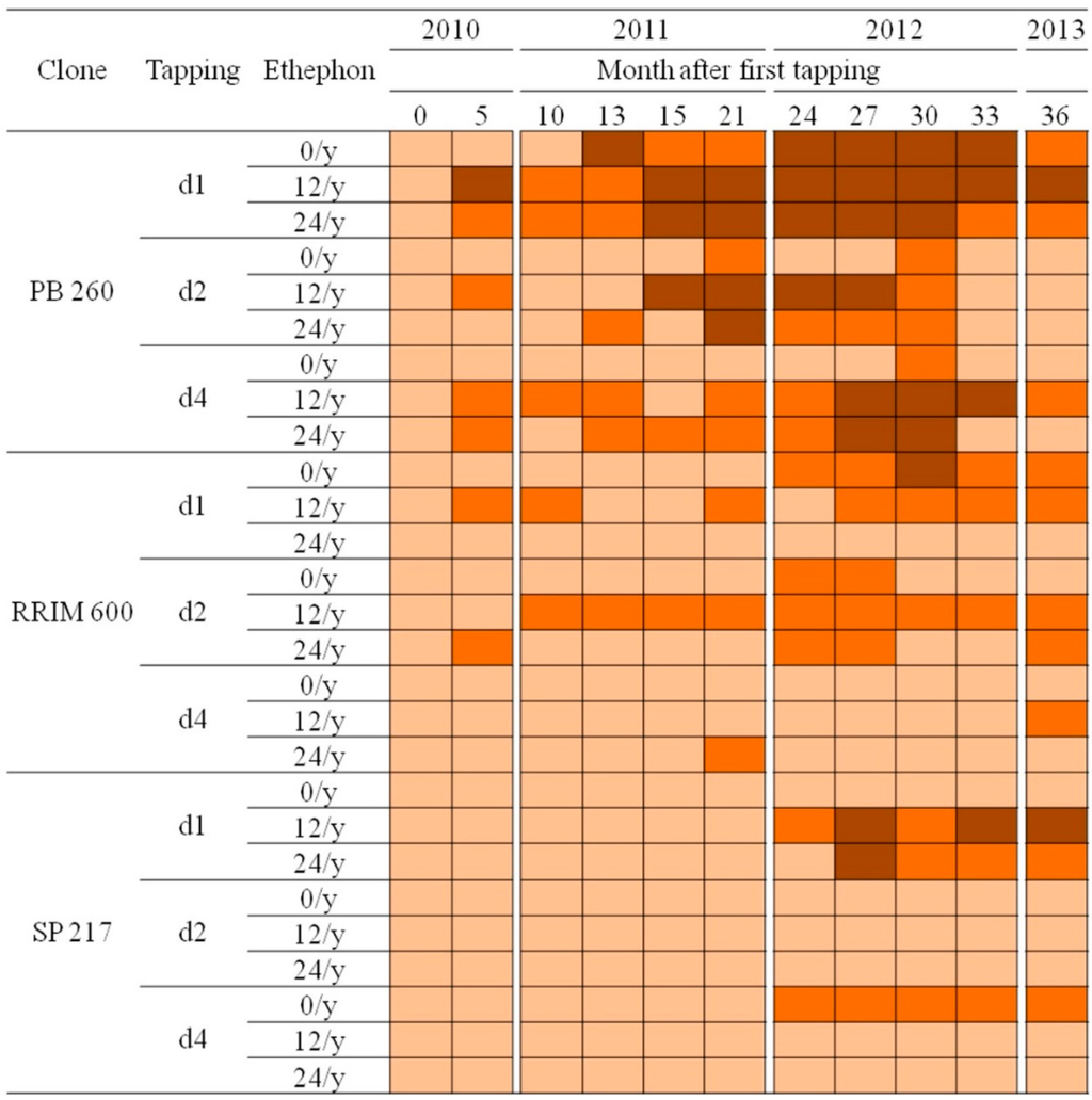 The interaction between clones, tapping and ethephon frequencies was analysed for the dry cut length (Table 1). A clone effect was significantly observed from 4 months to 2 years after tapping. Meanwhile, no combination effect was significantly observed. The effect of tapping or ethephon was significant in the third year. A detailed analysis revealed that clone PB 260 was significantly more susceptible to TPD than the other clones in the first 2 years after tapping (Table S1). No difference was significantly observed between clones RRIM 600 and SP 217. The effects of tapping and ethephon were significant only after three years of tapping and were consequently greater than the clone effect (Tables S2 and S3). At the late stages of TPD (more than 3 years after the first tapping), the differences between clones were no longer significant.