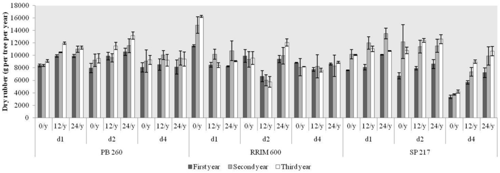 In order to estimate yield production, dry rubber was calculated for each year during the observation (Figure 5). The highest rubber production was 14,875 gram of dry rubber per tree per year for clone RRIM 600 with treatment d1 ET 0/y as opposed to the lowest one with 3334 for clone SP 217 with treatment d4 ET 0/y (Table S4). No clone effect was observed during three years of rubber production (Table S5). The effect of tapping was observed for treatment d1 and d4 at second and third year of production (Table S6). Finally, the different frequency of ethephon stimulation did not give significant difference in rubber production in the observation during this study (Table S7).