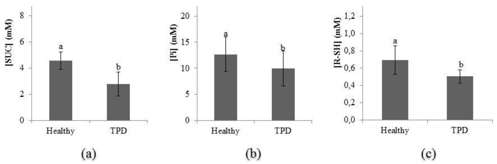 Sucrose (SUC; a), inorganic phosphorus (Pi; b) and thiol (R-SH; c) contents in latex of healthy and TPD-affected plants for clone PB 260. The Fisher’s F-test was used in the statistical analyses (p < 0.05).