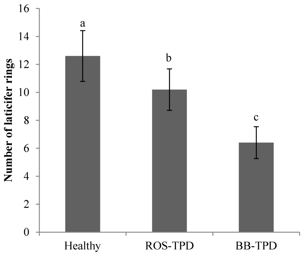 Number of laticifer rings in healthy, Tapping Panel Dryness (TPD)-affected trees, and brown bast (BB)-TPD-affected trees for high latex metabolism clone PB 260. The ANOVA test and the Newman–Keuls test were used in the statistical analyses (p < 0.05). Data with different letters (a, b, c) are significantly different at the level of 5%.
