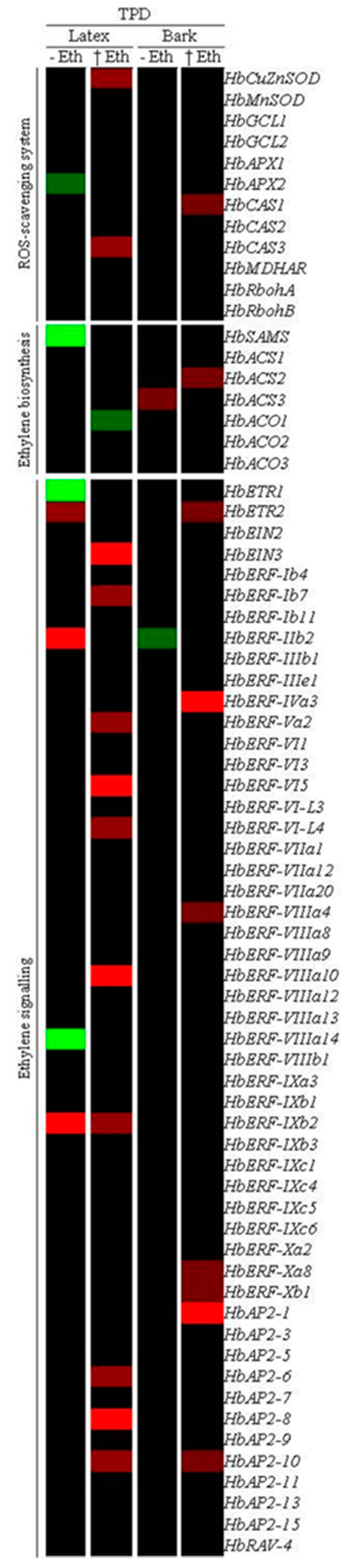 The transcript abundance ratio of 70 Hevea brasiliensis genes comparing TPD-affected and healthy trees was analysed in latex and bark of 6-year-old mature trees (Figure 9 and Table S9). These genes were selected for their potential involvement in TPD according to the literature: ethylene biosynthesis (7 genes) and signalling pathways (53 genes including Ethylene Response Factor (ERF)) and ROS-scavenging system (12 genes). Twenty-seven genes were differentially regulated in latex (16 genes), bark (8 genes) and both tissues (3 genes) under TPD for trees cultivated in the absence or presence of ethephon. Three genes were regulated in both latex and bark of TPD-affected trees: HbETR2, HbERF-IIb2 (up-regulated in latex and down-regulated in bark) and HbAP2-10. In latex, 3 genes (HbETR2, HbERF-IIb2, and HbERF-IXb2) were induced by TPD as opposed to 4 inhibited genes (HbAPX2, HbSAMS, HbERF-VIIIa14, and HbETR1) in non-stimulated trees. By contrast, 12 genes (HbCuZnSOD, HbCAS3, HbEIN3, HbERF-Ib7, HbERF-Va2, HbERF-VI5, HbERF-VI-L4, HbERF-VIIIa10, HbERF-IXb2, HbAP2-6, HbAP2-8, and HbAP2-10) were induced by TPD as opposed to 1 inhibited gene (HbACO1) in stimulated trees. In bark, 2 genes (HbACS3 and HbERF-Ib2) were induced and inhibited by TPD, respectively, in non-stimulated trees. Meanwhile, 9 genes (HbCAS1, HbACS2, HbETR2, HbERF-IVa3, HbERF-VIIIa4, HbERF-Xa8, HbERF-Xb1, HbAP2-1, and HbAP2-10) were induced by TPD in stimulated trees.