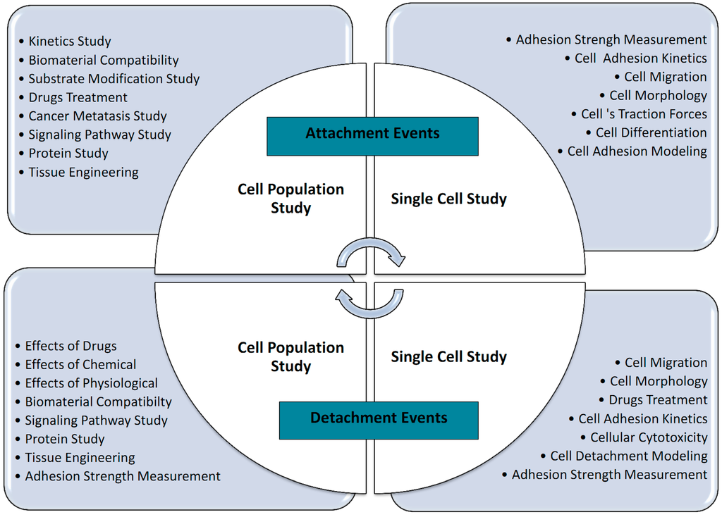 | Microfluidics | Straightforward construction and operation; Real-time observation and measurement; Convenience in size (compatible with cell sizes); Fast and simple to operate; Non-invasive to cell | Low detachment force; Restricted to short-term adhesion | Attachment events [96,97,98,99,100,101,102,103,107]; Detachment Events [19,24,107]; [197,198,199,200] |