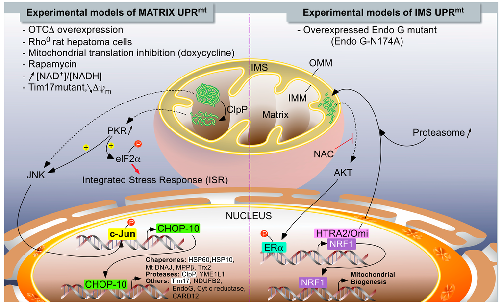 In mammals, two different models of UPRmt have been described (Figure 1). While Hoogenraad’s group described a DDIT3 (DNA damage-inducible transcript 3 protein)/CHOP-10-dependent UPRmt induced by the overexpression of a truncated form of a mitochondrial matrix enzyme [], Germain and colleagues reported a CHOP-10-independent UPRmt model in which protein aggregates accumulated within the internal membrane space (IMS) when a mutant (catalytically inactive enzyme) form of endonuclease G (N174A) was overexpressed in breast adenocarcinoma MCF-7 cells [].