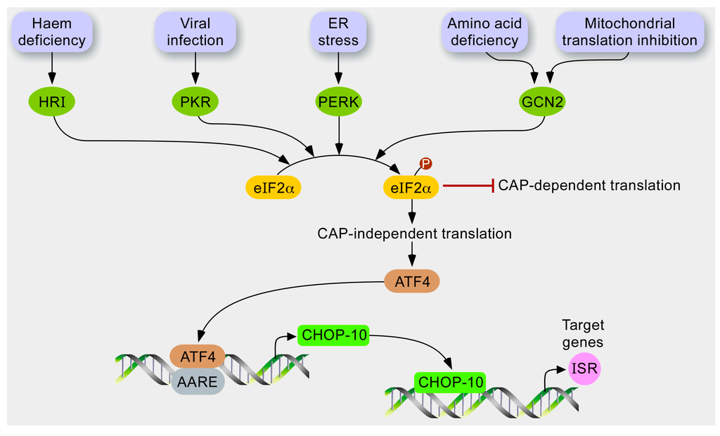 The ISR is a stress adaptive pathway conserved by evolution as recovered from yeast to human. In mammals, molecular effectors of this signaling pathway (Figure 2) are activated during ER stress, amino acid depletion [], virus infection, oxidative stress, heme deprivation, or UV irradiation [].